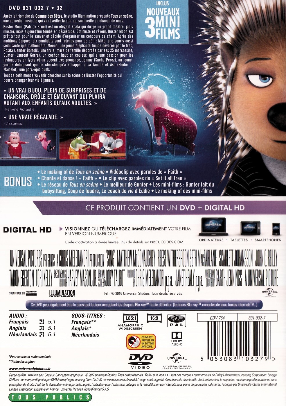 Buster Moon est un élégant koala qui dirige un grand théâtre, jadis illustre, mais aujourd'hui tombé en désuétude. Buster est un éternel optimiste, un peu bougon, qui aime son précieux théâtre au-delà de tout et serait prêt à tout pour le sauver. C'est alors qu'il trouve une chance en or pour redorer son blason tout en évitant la destruction de ses rêves et de toutes ses ambitions: une compétition mondiale de chant. Cinq candidats sont retenus pour ce défi : Une souris aussi séduisante que malhonnête, un jeune éléphant timide dévoré par le trac, une truie mère de famille débordée par ses 25 marcassins, un jeune gorille délinquant qui ne cherche qu'à échapper à sa famille, et une porc épic punk qui peine à se débarrasser de son petit ami à l'égo surdimensionné pour faire une carrière solo. Tout ce petit monde va venir chercher sur la scène de Buster l'opportunité qui pourra changer leur vie à jamais.