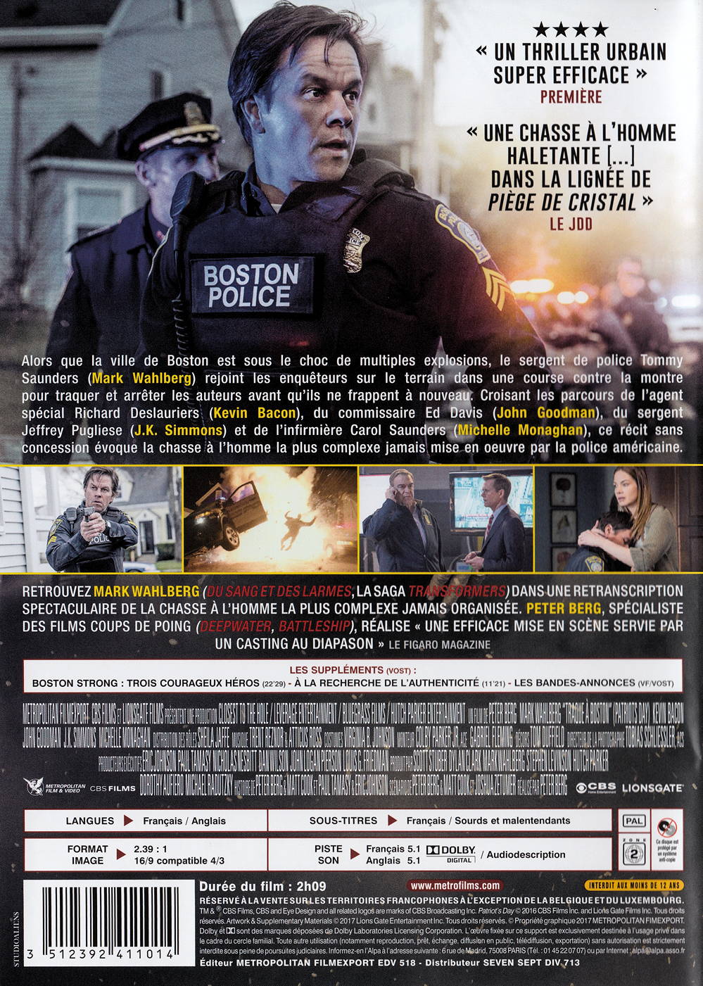Alors que la ville de Boston est sous le choc de multiples explosions, le sergent de police Tommy Saunders rejoint les enquêteurs sur le terrain dans une course contre la montre pour traquer et arrêter les auteurs avant qu'ils ne frappent à nouveau. Croisant les parcours de l'agent spécial Richard Deslauriers, du commissaire Ed Davis, du sergent Jeffrey Pugliese et de l'infirmière Carol Saunders, ce récit sans concession évoque la chasse à l'homme la plus complexe jamais mise en oeuvre par la police américaine ? et rend un vibrant hommage aux héros du quotidien.