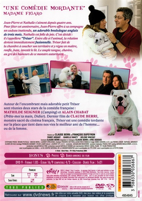 Jean-Pierre et Nathalie s'aiment depuis quatre ans. Pour fêter cet anniversaire, Jean-Pierre offre à sa compagne un cadeau inattendu, un adorable bouledogue anglais de trois mois. Nathalie est folle de joie. C'est décidé : il s'appellera "Trésor". Entre elle et l'animal, la relation devient immédiatement fusionnelle. Trésor fait de la chambre à coucher son territoire et y règne en maître, ronfle, bave, investit le lit. Le couple tangue, chavire, au gré des humeurs de ce monstre autoritaire...