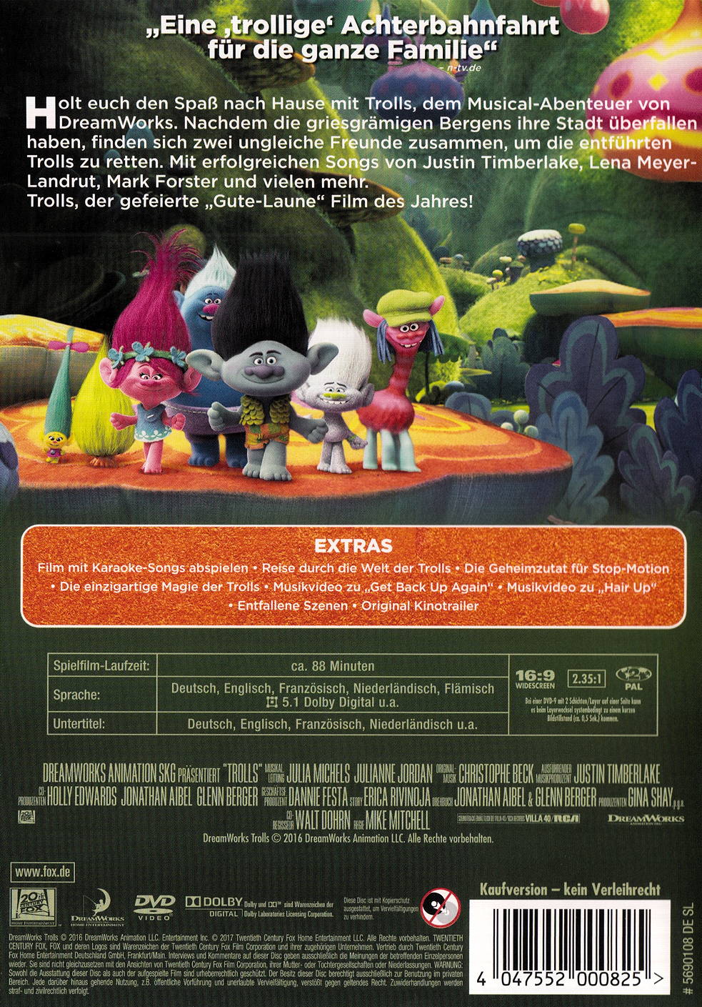 Von den Machern von Shrek kommt die coolste, lustigste und frechste animierte Komödie dieses Jahres, Dreamworks' Trolls. Begib dich auf die Reise in eine bunte, wundersame Welt, die von ausgelassenen und unvergesslichen Charakteren bewohnt wird. Entdecke die Geschichte der über-optimistischen Trolls, die immer ein Lied auf den Lippen haben, und den dauer-pessimistischen Bergen, die nur dann zufrieden sind, wenn sie einen Troll im Magen haben.