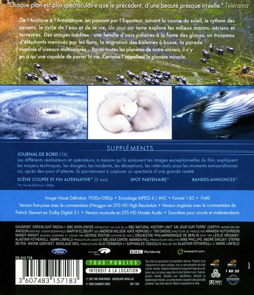 De l'Arctique à l'Antarctique, en passant par l'Equateur, suivant la course du soleil, le rythme des saisons, le cycle de l'eau et de la vie, "Un jour sur terre" explore les milieux marins, aériens et terrestres. Des images inédites : une famille d'ours polaires à la fonte des glaces, un troupeau d'éléphants menacés par les lions, la migration des baleines à bosse, la parade nuptiale d'oiseaux multicolores... Parmi toutes les planètes de notre univers, il n'y en a qu'une capable de porter la vie. Certains l'appellent la planète miracle.