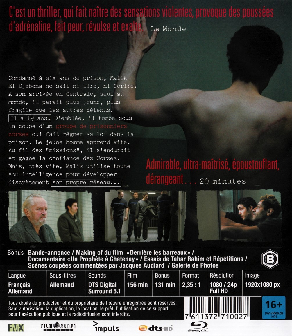 Lorsqu’il arrive en centrale à 19 ans, Malik El Djebena ne sait ni lire ni écrire. Il a pris six ans et devient le larbin de César Luciani, le caïd corse qui fait sa loi dans la prison. Mais Malik apprend tout très vite: l’alphabet, le corse, le business. Et il est bien décidé à tout faire pour inverser les rôles...