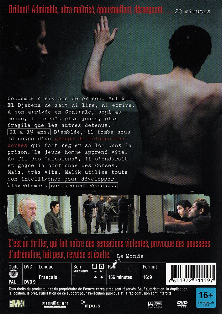 Lorsqu’il arrive en centrale à 19 ans, Malik El Djebena ne sait ni lire ni écrire. Il a pris six ans et devient le larbin de César Luciani, le caïd corse qui fait sa loi dans la prison. Mais Malik apprend tout très vite: l’alphabet, le corse, le business. Et il est bien décidé à tout faire pour inverser les rôles...