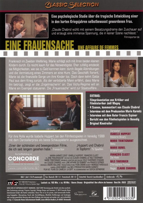 Par solidarité en ce début de guerre, Marie, mère de famille d'une trentaine d'années, va aider sa voisine à se débarrasser d'un enfant non désiré. Bientôt, c'est l'engrenage. Les 'services' de Marie se rétribueront et deviendront son gagne-pain. Mais, Marie, la faiseuse d'anges est dénoncée. Sous Vichy, une dénonciation équivaut à une exécution. Marie est arrêté et condamnée. 'Une affaire de femmes' obtient le Golden Globe 1989 du meilleur film étranger.