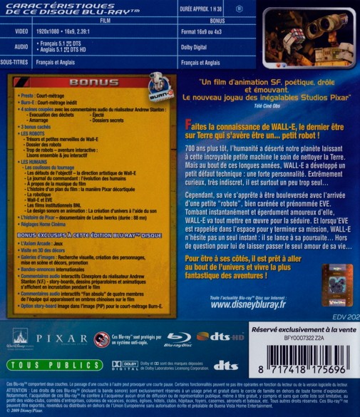 WALL-E est le dernier être sur Terre et s'avère être un... petit robot ! 700 ans plus tôt, l'humanité a déserté notre planète laissant à cette incroyable petite machine le soin de nettoyer la Terre. Mais au bout de ces longues années, WALL-E a développé un petit défaut technique : une forte personnalité. Extrêmement curieux, très indiscret, il est surtout un peu trop seul...