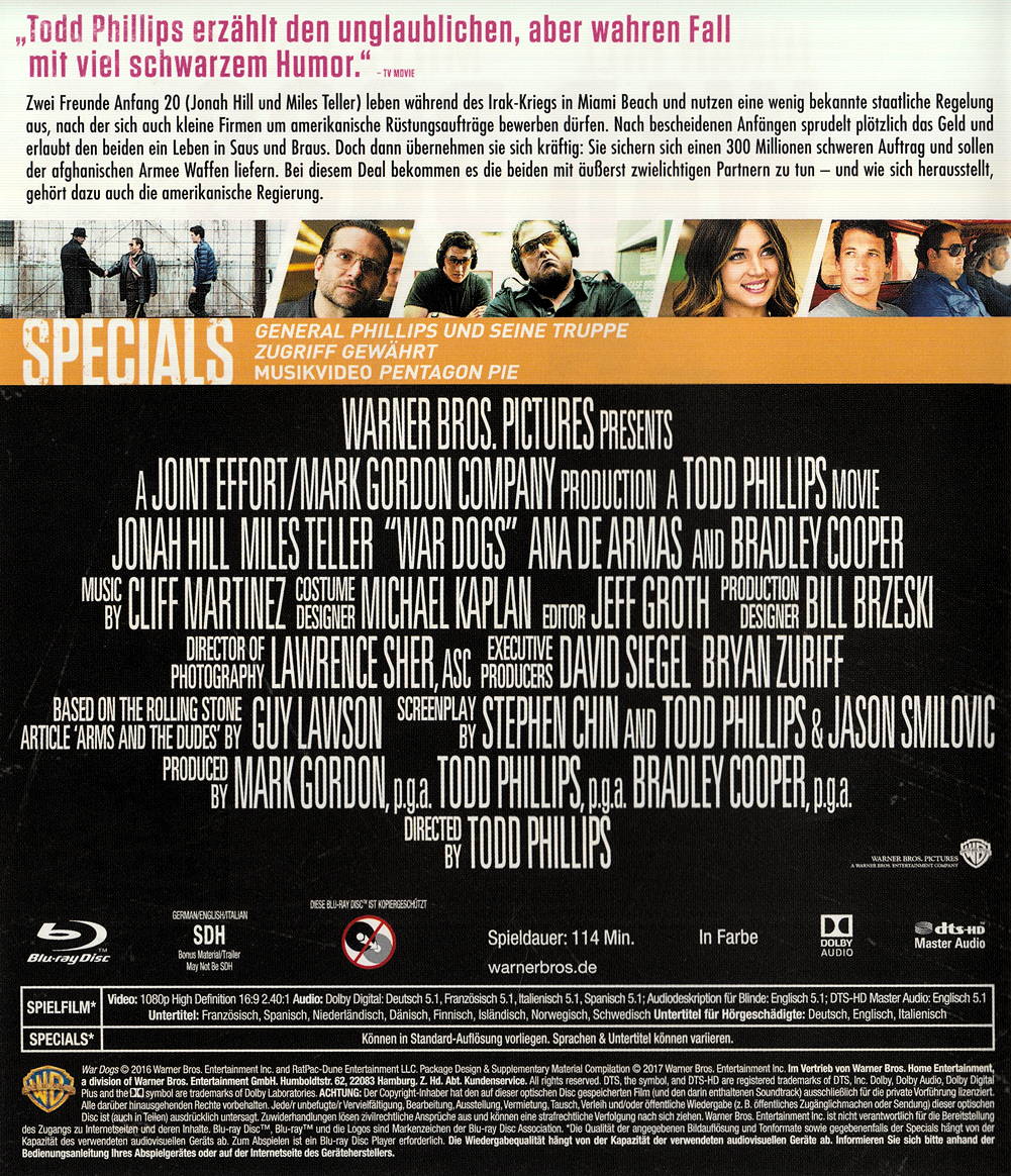 "War Dogs" beruht auf einer wahren Geschichte: Zwei Freunde Anfang 20 leben während des ersten Irak-Kriegs in Miami und nutzen eine wenig bekannte staatliche Regelung aus, nach der sich auch kleine Firmen um amerikanische Rüstungsaufträge bewerben dürfen. Nach bescheidenen Anfängen sprudelt plötzlich das Geld und erlaubt den beiden ein Leben in Saus und Braus. Doch dann verheben sie sich kräftig: Sie sichern sich einen 300 Millionen schweren Auftrag und sollen der afghanischen Armee Waffen liefern - bei diesem Deal bekommen es die beiden mit äusserst zwielichtigen Partnern zu tun - und wie sich herausstellt, gehört dazu auch die amerikanische Regierung.