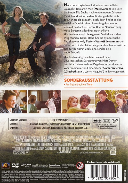 Nach dem tragischen Tod seiner Frau sucht Journalist Benjamin Mee (Matt Damon) einen Neuanfang für sich und seine beiden Kinder. Die Suche nach dem neuen Zuhause gestaltet sich schwieriger als gedacht, doch dann finden die drei das perfekte Domizil: einen heruntergekommen Zoo mit exotischen Tieren, der kurz vor der Pleite steht. Vor der Neueröffnung müssen die Mees nicht nur mit allerhand "tierischen" Problemen klarkommen, sondern gemeinsam auch etliche Hindernisse - und die eigenen Zweifel - aus dem Weg räumen. Unterstützt werden sie dabei von der mutigen Tierpflegerin Kelly Foster (Scarlett Johansson)… und erleben das vielleicht grösste Abenteuer ihres Lebens!
