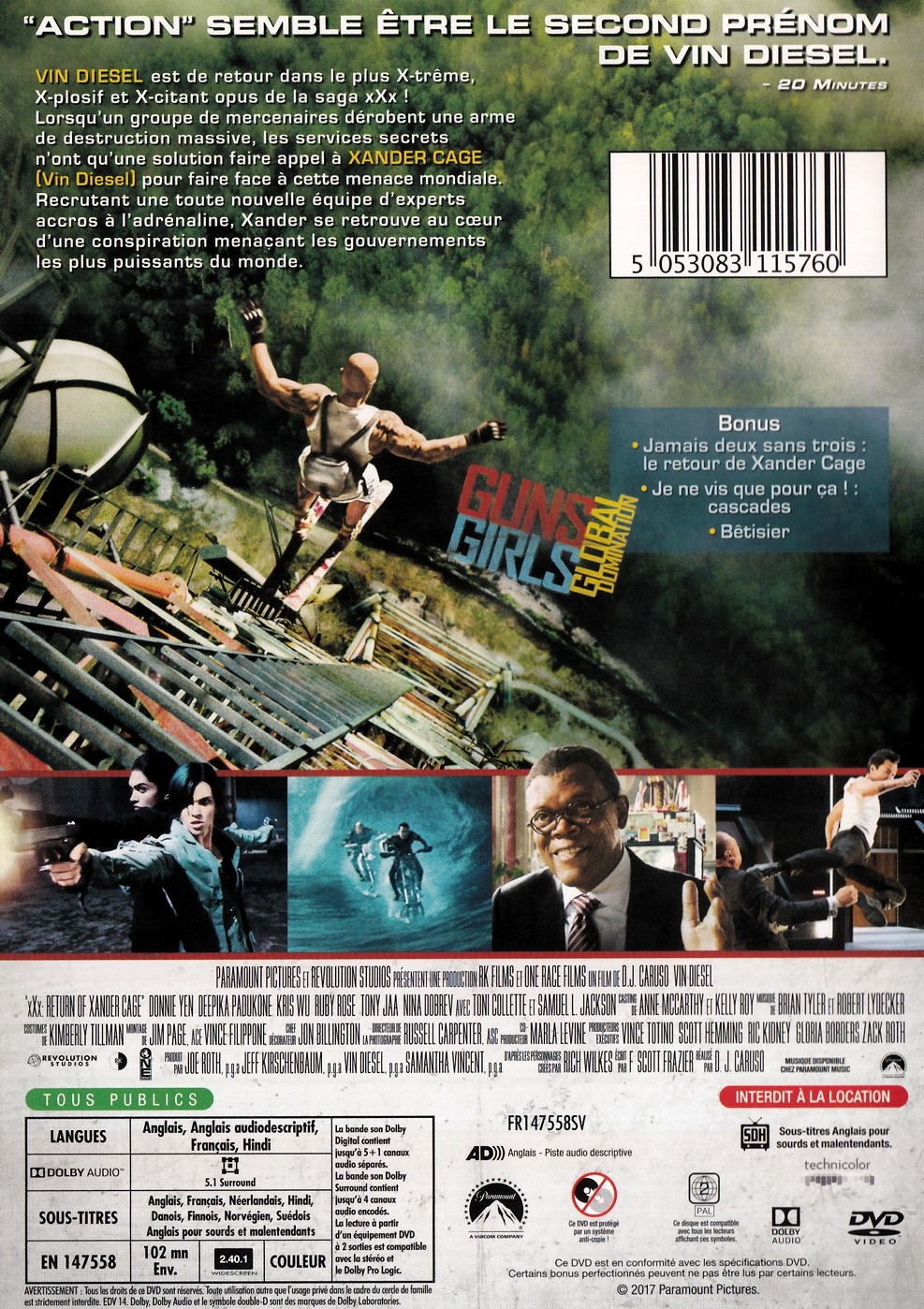 Xander Cage, sportif de l'extrême devenu agent d'élite, sort de l'exil qu'il s'était imposé, pour affronter le redoutable guerrier alpha Xiang et son équipe. Il entre dans une course impitoyable afin de récupérer une arme de destruction massive connue sous le nom de Boîte de Pandore. Recrutant une toute nouvelle équipe d'experts accros à l'adrénaline, Xander se retrouve au coeur d'une conspiration menaçant les gouvernements les plus puissants du monde.