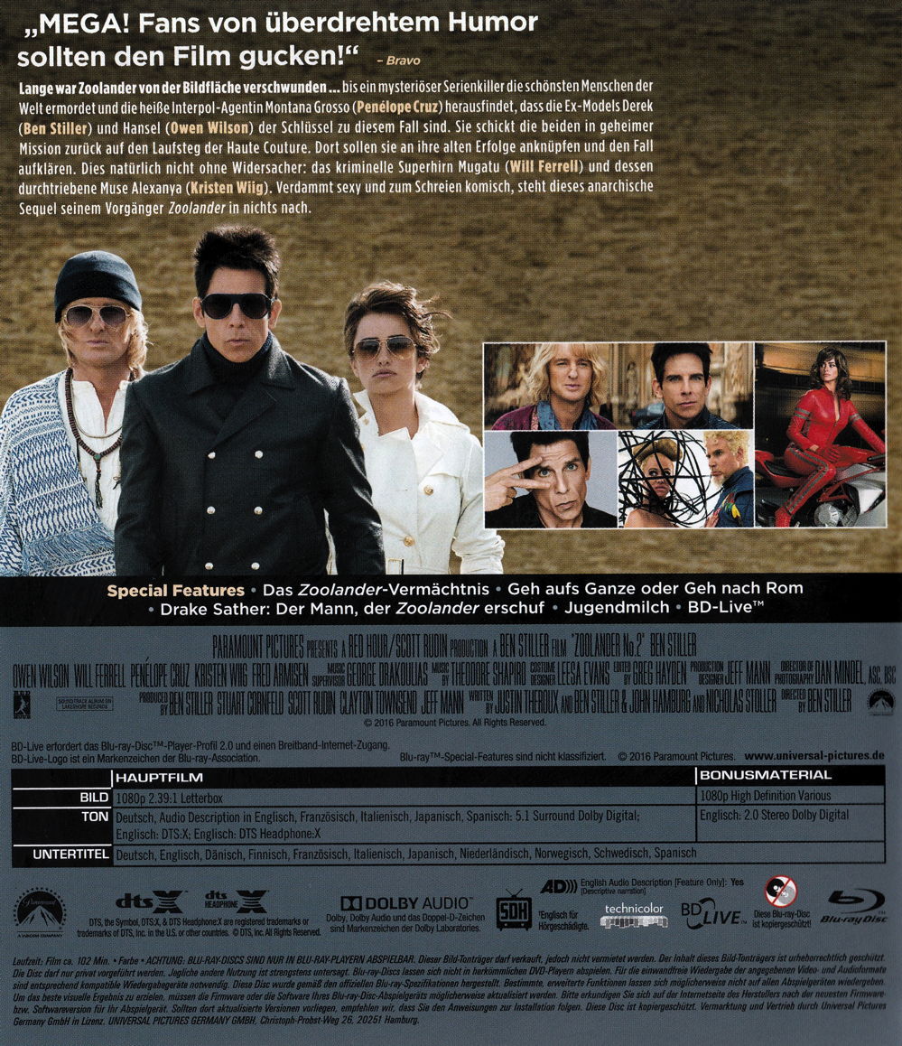 Die Welt braucht Derek Zoolander mehr denn je! Denn bereits mehrere Berühmtheiten wurden ermordet. Und alle haben während ihres letzten Atemzugs noch schnell ein Selfie im "Blue Steel"-Look gemacht. Eigentlich hat die Modebranche Derek vergessen und er will auch nichts mehr mit ihr zu tun haben. Er und Hansel haben sich zur Ruhe gesetzt. Doch ohne ihre Hilfe ist die gesamte VIP-Welt in grosser Gefahr. Dass auch Modezar Mugatu wieder seine Finger im Spiel zu haben scheint, macht das Ganze nicht einfacher. Die Rettung aus dieser mehr als bedrohlichen Lage erfordert den geballten Intellekt der beiden Ex-Models. Die notwendige Unterstützung bekommen sie dabei von der resoluten Montana Grosso, die immer noch darunter leidet, dass sie wegen ihrer beachtlichen Oberweite als Model nie High Fashion präsentieren durfte, sondern auf Bademoden und Unterwäsche reduziert war.