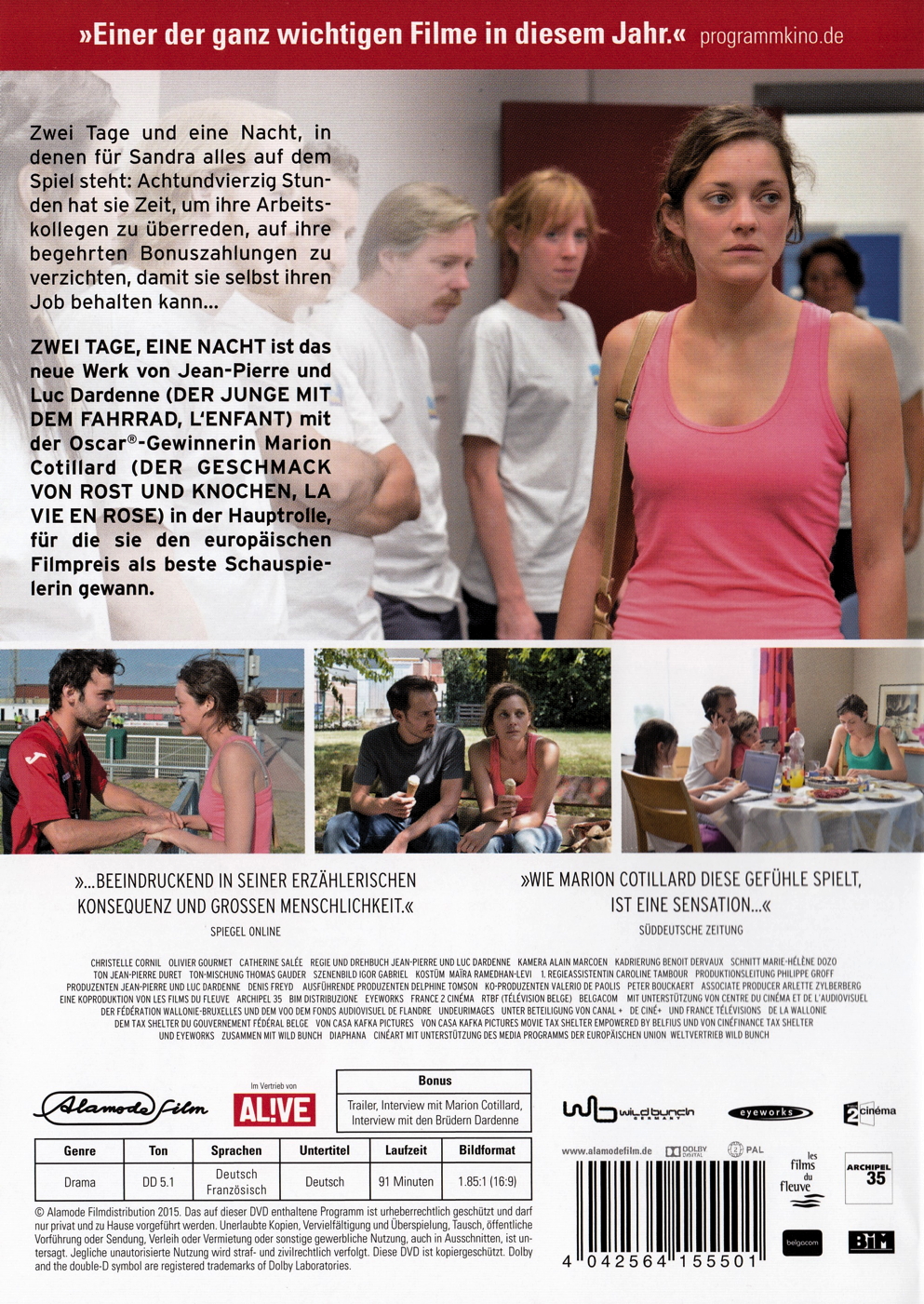 Marion Cotillard, Fabrizio Rongione, Pili Groyne, Simon Caudry, Catherine Salée, Jean-Pierre Duret, Igor Gabriel, Valerio De Paolis, Maïra Ramedhan Lévy, Delphine Tomson...Maria Ramedhan-Levi, Jean-Pierre Dardenne, Alain Marcoen, Marie-Hélène Dozo, Peter Bouckaert, Luc Dardenne, Denis Freyd