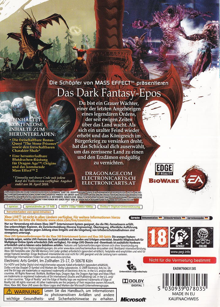 Von den Machern von Baldur’s Gate, Star Wars: Knights of the Old Republic und Mass Effect kommt nun der Entertainment-Blockbuster 2009. Während der letzten 400 Jahre ist die Welt langsam zerfallen und ein Bürgerkrieg ist ausgebrochen. Nun liegt es an dir, einem der letzten legendären Krieger, bekannt als die Grauen Wächter, die zerrütteten Lande wieder zu vereinen und das bevorstehende Armageddon abzuwenden, das durch die Wiederauferstehung einer unheimlichen Macht droht. Wähle deine Vergangenheit, forme die Gegenwart und bestimme deine Zukunft, während du auf eine heldenhafte Reise gehst, die auch Opfer erfordert, um siegreich zu sein. Wie wirst du die Menschheit retten?