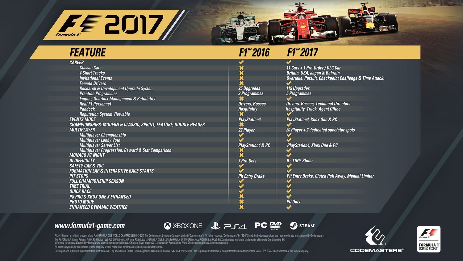 F1 2017 ist das offizielle Videospiel der 2017 FIA FORMULA ONE WORLD CHAMPIONSHIPT und beinhaltet den vollständigen Rennkalender der Saison 2017 mit allen offiziellen Strecken, Fahrern und Teams.