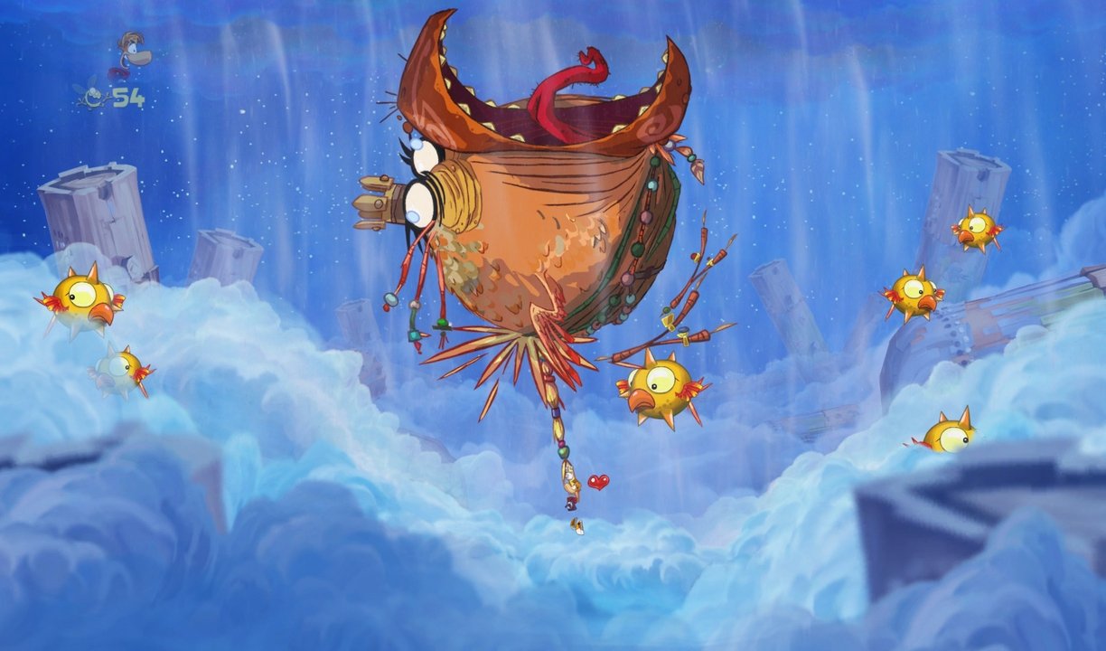 Epische Bosskämpfe: Ein gigantisches rosa Monster mit Hunderten Augen, ein besessener Gebirgsgolem, eine gemeine, Gänse-blümchensaft trinkende Pflanze: In Rayman Origins muss der Spieler diese und viele weitere anspruchsvolle Showdowns bestehen!