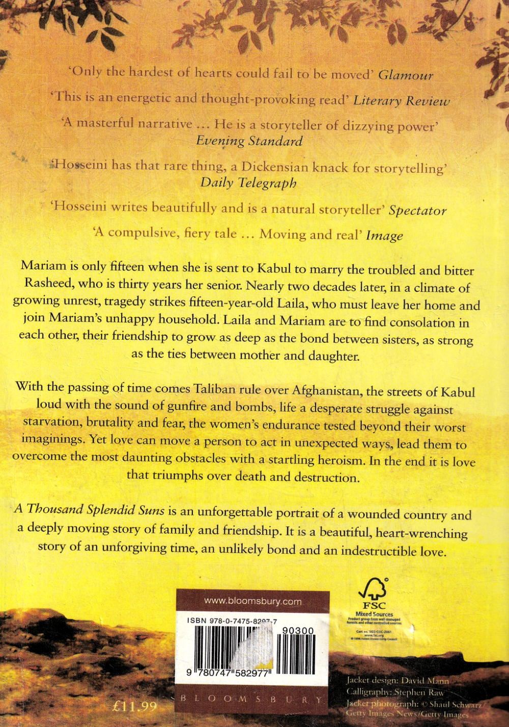 Mariam is only fifteen when she is sent to Kabul to marry the troubled and bitter Rasheed, who is thirty years her senior. Nearly two decades later, in a climate of growing unrest, tragedy strikes fifteen-year-old Laila, who must leave her home and join Mariam's unhappy household. Laila and Mariam are to find consolation in each other, their friendship to grow as deep as the bond between sisters, as strong as the ties between mother and daughter. With the passing of time comes Taliban rule over Afghanistan, the streets of Kabul loud with the sound of gunfire and bombs, life a desperate struggle against starvation, brutality and fear, the women's endurance tested beyond their worst imaginings. Yet love can move a person to act in unexpected ways, lead them to overcome the most daunting obstacles with a startling heroism. In the end it is love that triumphs over death and destruction. A Thousand Splendid Suns is an unforgettable portrait of a wounded country and a deeply moving story of family and friendship. It is a beautiful, heart-wrenching story of an unforgiving time, an unlikely bond and an indestructible love.