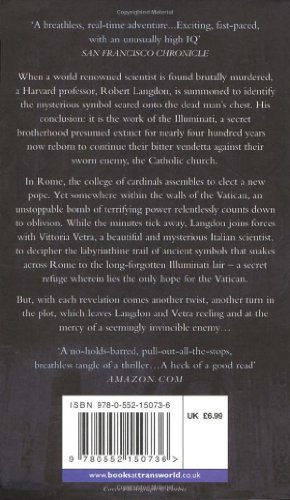 When a world renowned scientist is found brutally murdered, a Harvard professor, Robert Langdon, is summoned to identify the mysterious symbol seared onto the dead man's chest. His conclusion: it is the work of the Illuminati, a secret brotherhood presumed extinct for nearly four hundred years - now reborn to continue their bitter vendetta against their sworn enemy, the Catholic church.