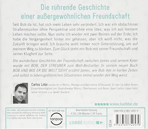 Als James Bowen den verwahrlosten Kater vor seiner Wohnungstür fand, hätte man kaum sagen können, wem von beiden es schlechter ging. James schlug sich als Strassenmusiker durch, er hatte eine harte Zeit auf der Strasse hinter sich. Aber dem abgemagerten, jämmerlich maunzenden Kater konnte er einfach nicht widerstehen, er nahm ihn auf, pflegte ihn gesund und liess ihn wieder laufen. Doch Bob war anders als andere Katzen. Er liebte seinen neuen Freund mehr als die Freiheit und blieb. Heute sind sie eine stadtbekannte Attraktion, ihre Freundschaft geht Tausenden zu Herzen ...