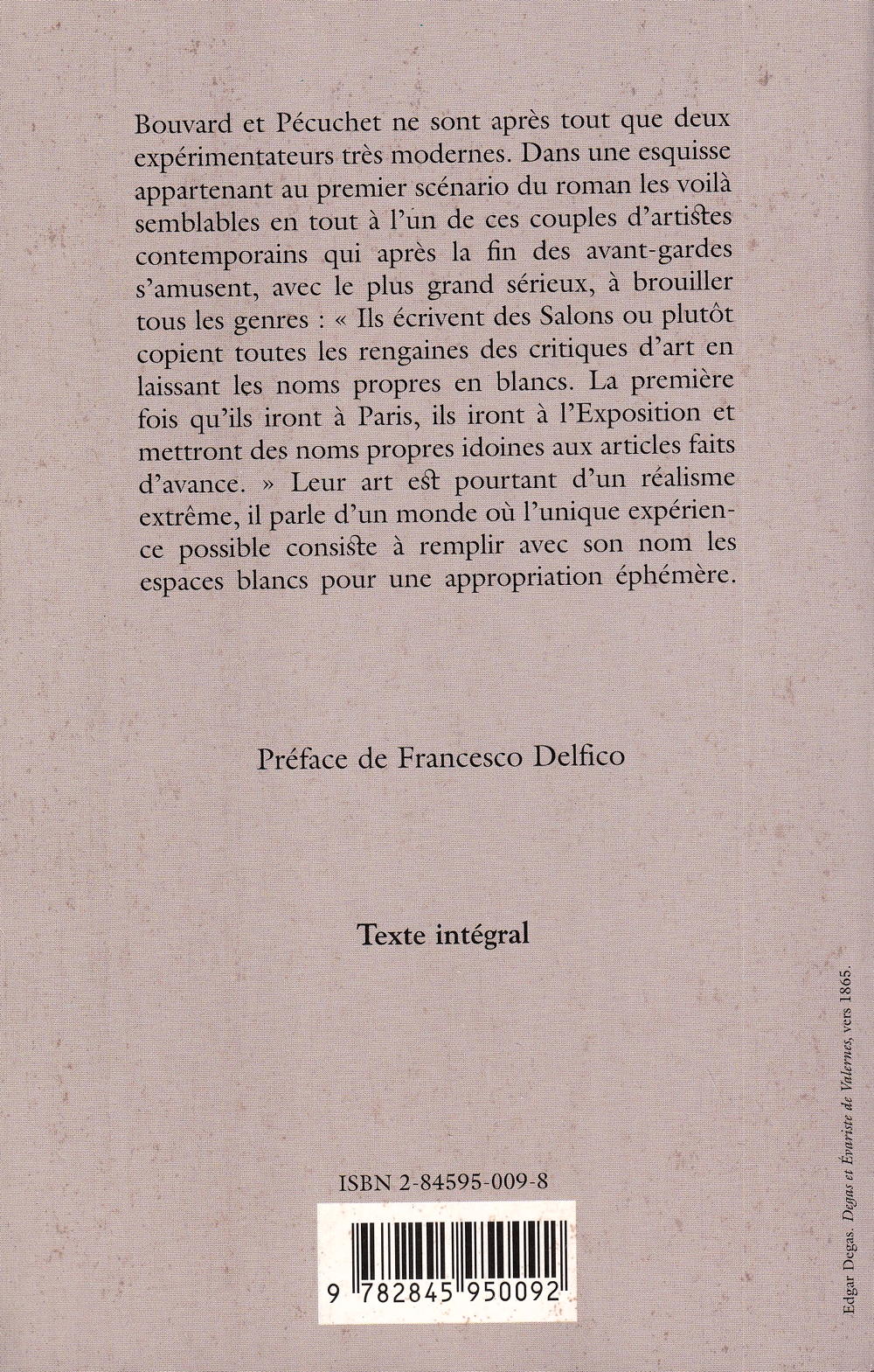 Bouvard et Pécuchet ne sont après tout que deux expérimentateurs très modernes. Dans une esquisse appartenant au premier scénario du roman les voilà semblables en tout à l'un de ces couples d'artistes contemporains qui après la fin des avant-gardes s'amusent, avec le plus grand sérieux, à brouiller tous les genres: « Ils écrivent des Salons ou plutôt copient toutes les rengaines des critiques d'art en laissant les noms propres en blancs. La première fois qu'ils iront à Paris, ils iront à l'Exposition et mettront des noms propres idoines aux articles faits d'avance. » Leur art est pourtant d'un réalisme extrême, il parle d'un monde où l'unique expérience possible consiste à remplir avec son nom les espaces blancs pour une appropriation éphémère.