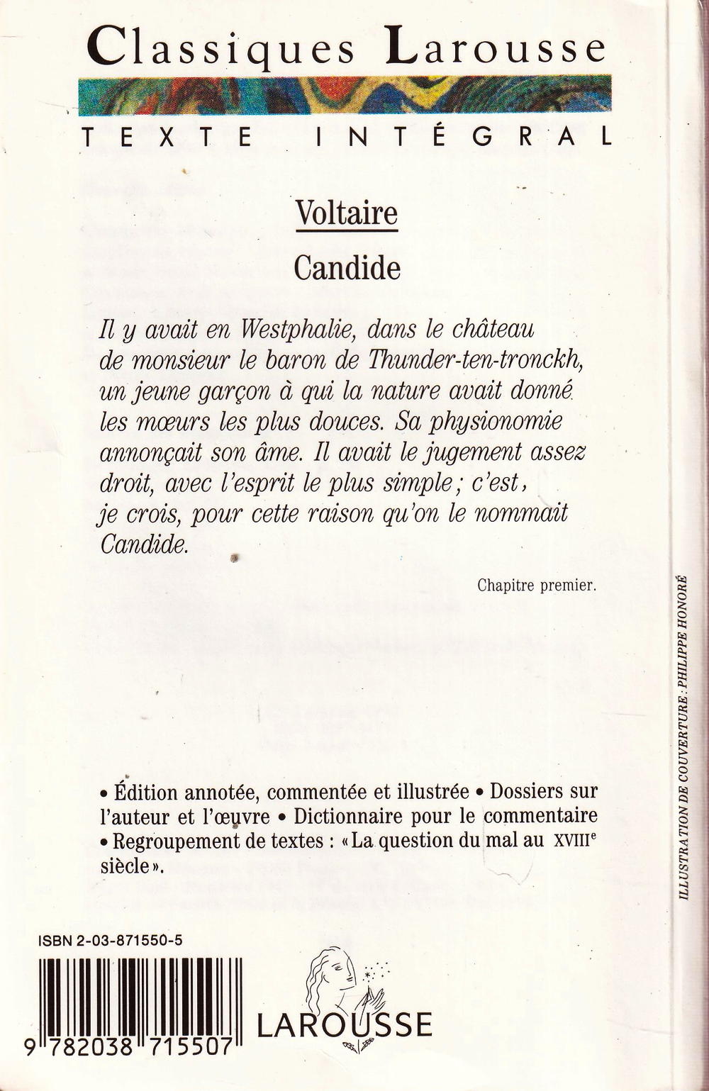 Il y avait en Westphalie, dans le château de monsieur le baron de Thunder-ten-tronckh, un jeune garçon à qui la nature avait donné les mæurs les plus douces. Sa physionomie annonçait son âme. Il avait le jugement assez droit, avec l'esprit le plus simple; c'est, je crois, pour cette raison qu'on le nommait Candide.