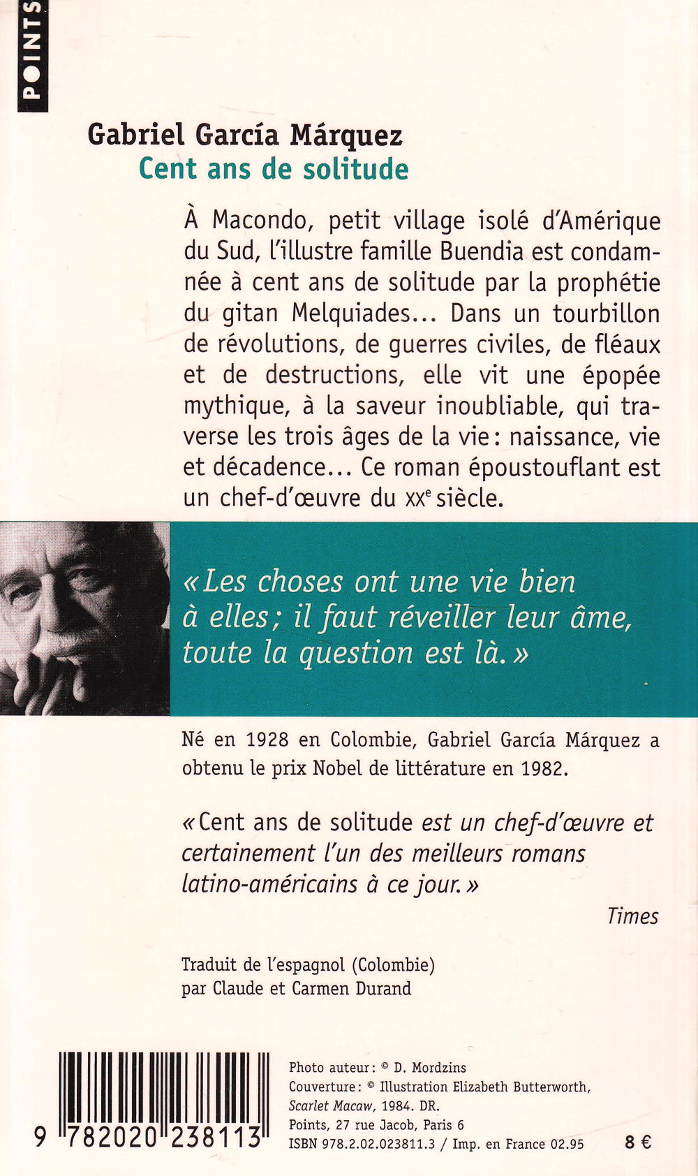 À Macondo, petit village isolé d'Amérique du Sud, l'illustre famille Buendia est condamnée à cent ans de solitude par la prophétie du gitan Melquiades... Dans un tourbillon de révolutions, de guerres civiles, de fléaux et de destructions, elle vit une épopée mythique, à la saveur inoubliable, qui traverse les trois âges de la vie: naissance, vie et décadence... Ce roman époustouflant est un chef-d'oeuvre du XXe siècle.