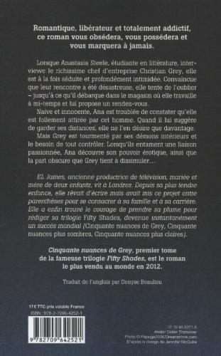 EL James, ancienne productrice de télévision, mariée et mère de deux enfants, vit à Londres. Depuis sa plus tendre enfance, elle rêvait d'écrire des récits dont les lecteurs tomberaient amoureux, mais avait mis ces rêves entre parenthèses pour se consacrer à sa famille et à sa carrière. Elle a enfin trouvé le courage de prendre sa plume pour rédiger son premier roman, Cinquante nuances de Grey. Elle est également l'auteur de Cinquante nuances plus sombres et de Cinquante nuances plus claires.