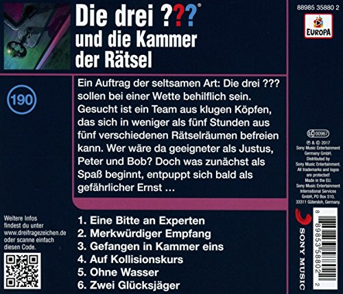 Ein Auftrag der seltsamen Art: Die drei ??? sollen bei einer Wette behilflich sein. Gesucht ist ein Team aus klugen Köpfen, das sich in weniger als fünf Stunden aus fünf verschiedenen Rätselräumen befreien kann. Wer wäre da geeigneter als Justus, Peter und Bob? Doch was zunächst als Spass beginnt, entpuppt sich bald als gefährlicher Ernst...