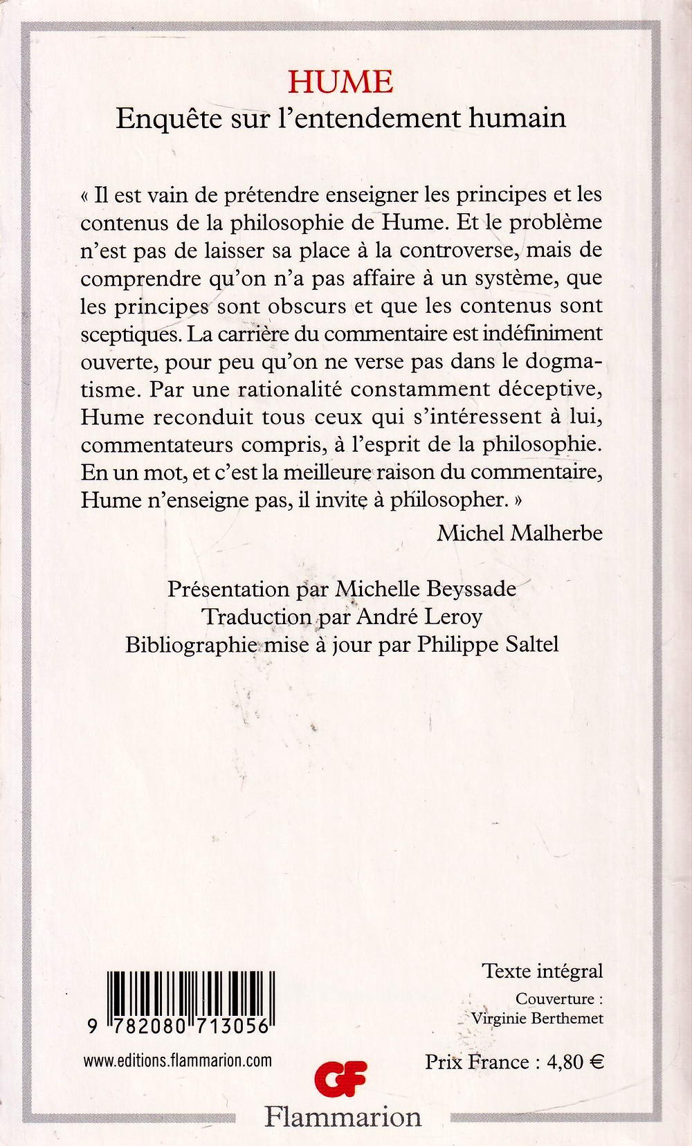 « Il est vain de prétendre enseigner les principes et les contenus de la philosophie de Hume. Et le problème n'est pas de laisser sa place à la controverse, mais de comprendre qu'on n'a pas affaire à un système, que les principes sont obscurs et que les contenus sont sceptiques. La carrière du commentaire est indéfiniment ouverte, pour peu qu'on ne verse pas dans le dogmatisme. Par une rationalité constamment déceptive, Hume reconduit tous ceux qui s'intéressent à lui, commentateurs compris, à l'esprit de la philosophie. En un mot, et c'est la meilleure raison du commentaire, Hume n'enseigne pas, il invite à philosopher. »