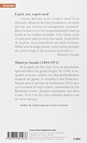Esprit zen, esprit neuf Nous devons avoir l'esprit neuf d'un débutant, affranchi de toute possession, un esprit qui sait que tout est en changement continuel. Rien n'existe si ce n'est momentanément dans sa forme et sa couleur actuelles. Une chose coule en une autre sans pouvoir être saisie. Avant la fin de la pluie, nous entendons un chant d'oiseau. Même sous la neige épaisse, nous voyons poindre des perce-neige et des pousses nouvelles. Shunryu SuzukiShunryu Suzuki (1904-1971) De la lignée du Zen Soto, il est un descendant spirituel direct du grand Dogen. En 1958, à cinquante-trois ans, maître zen déjà profondément respecté au Japon, il s'installa à San Francisco. Naquit ainsi le groupe de méditation Zen Center qui a essaimé en sept centres, notamment le Zen Mountain Center, premier monastère zen hors d'Asie. Il est l'un des plus influents maîtres zen de notre époque. Traduit de l'américain par Sylvie Carteron