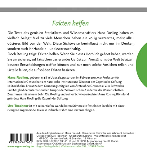 Es wird alles immer schlimmer, eine schreckliche Nachricht jagt die andere: Die Reichen werden reicher, die Armen ärmer. Es gibt immer mehr Kriege, Gewaltverbrechen, Naturkatastrophen. Viele Menschen tragen solche beängstigenden Bilder im Kopf. Doch sie liegen damit grundfalsch. Unser Gehirn verführt uns zu einer dramatisierenden Weltsicht, die mitnichten der Realität entspricht, wie der geniale Statistiker und Wissenschaftler Hans Rosling erklärt. Wer dieses Hörbuch gehört hat, wird ein sicheres, auf Fakten basierendes Gerüst besitzen, um die Welt so zu sehen, wie sie wirklich ist und Urteile zu fällen, die auf soliden Fakten basieren.