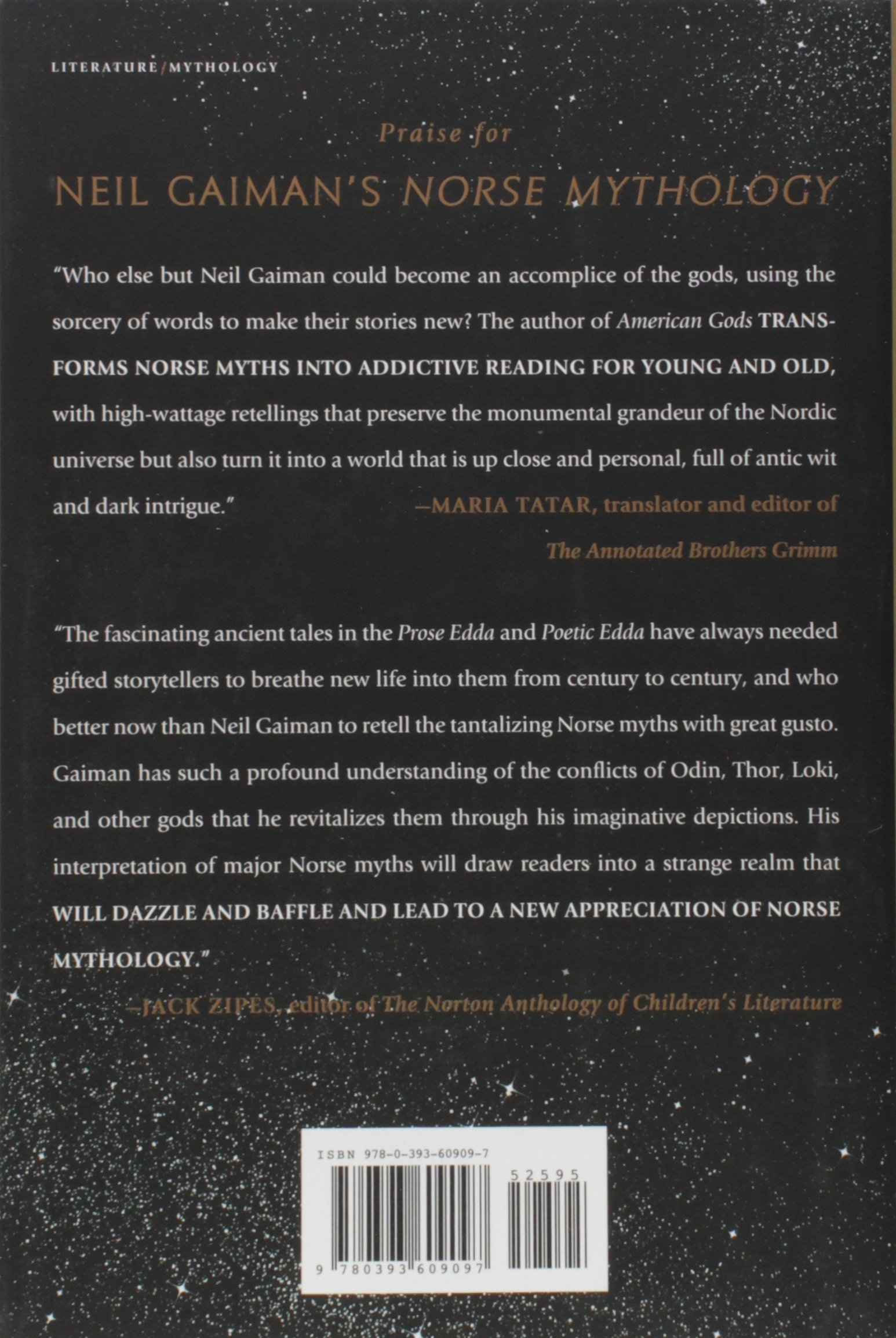 Neil Gaiman has long been inspired by ancient mythology in creating the fantastical realms of his fiction. Now he turns his attention back to the source, presenting a bravura rendition of the great northern tales.In Norse Mythology, Gaiman stays true to the myths in envisioning the major Norse pantheon: Odin, the highest of the high, wise, daring, and cunning; Thor, Odins son, incredibly strong yet not the wisest of gods; and Lokison of a giantblood brother to Odin and a trickster and unsurpassable manipulator.Gaiman fashions these primeval stories into a novelistic arc that begins with the genesis of the legendary nine worlds and delves into the exploits of deities, dwarfs, and giants. Once, when Thors hammer is stolen, Thor must disguise himself as a womandifficult with his beard and huge appetiteto steal it back. More poignant is the tale in which the blood of Kvasirthe most sagacious of godsis turned into a mead that infuses drinkers with poetry. The work culminates in Ragnarok, the twilight of the gods and rebirth of a new time and people.Through Gaimans deft and witty prose emerge these gods with their fiercely competitive natures, their susceptibility to being duped and to duping others, and their tendency to let passion ignite their actions, making these long-ago myths breathe pungent life again.