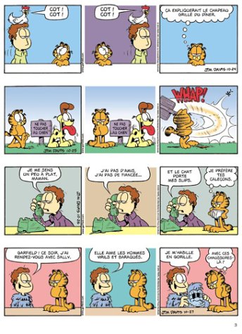 Garfield ne connaît qu'un chemin entre son lit et sa gamelle: tout schuss, à fond et tant pis pour les autres. Piétinant Odie et Jon, rien ne saurait l'arrêter dans sa course à la goinfrerie et aux calories. Gare aux imprudents ! ! !