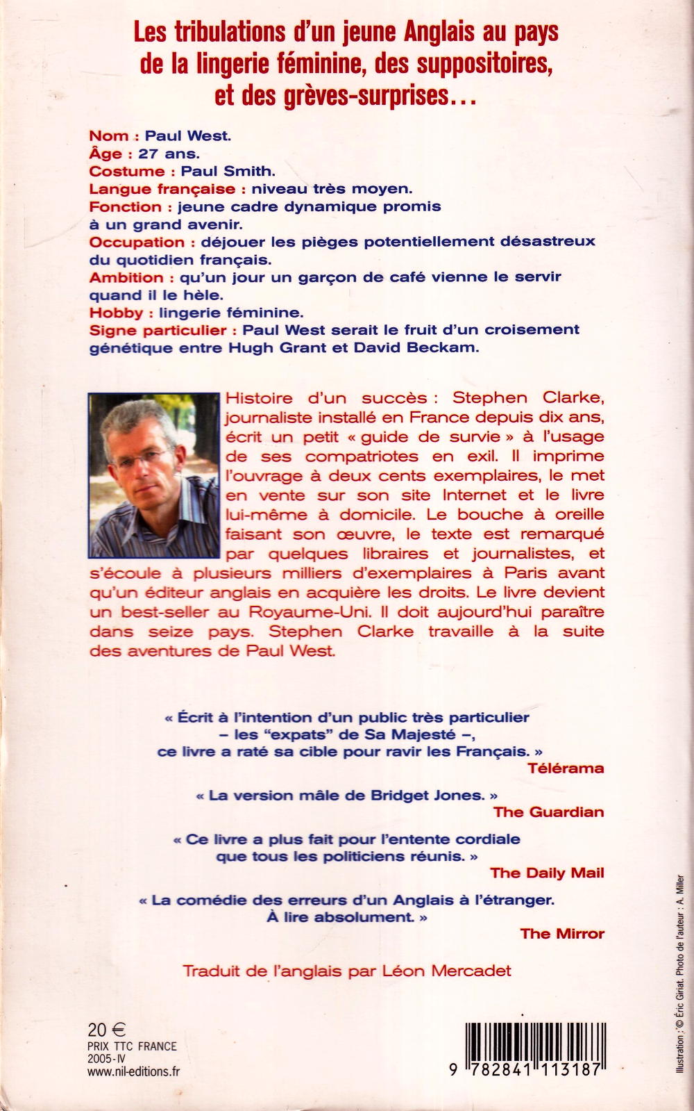 Les tribulations d'un jeune anglais au pays de la lingerie féminine, des suppositoires et des grèves - surprises...Nom: Paul West. Age: 27 ans. Costume: Paul Smith. Langue française: niveau très moyen. Fonction: jeune cadre dynamique promis à un grand avenir. Occupation: déjouer les pièges potentiellement désastreux du quotidien français. Ambition: qu'un jour un garçon de café vienne le servir quand il le hèle. Hobby: lingerie féminine. Signe particulier: Paul West serait le fruit d'un croisement génétique entre Hugh Grant et David Beckam. Histoire d'un succès: Stephen Clarke, journaliste installé en France depuis dix ans, écrit un petit guide de survie à l'usage de ses compatriotes en exil. Il imprime l'ouvrage à deux cents exemplaires, le met en vente sur son site Internet et le livre lui-même à domicile. Le bouche à oreille faisant son œuvre, le texte est remarqué par quelques libraires et journalistes, et s'écoule à plusieurs milliers d'exemplaires à Paris avant qu'un éditeur anglais en acquière les droits. Le livre devient un best-seller au Royaume-Uni. Il doit aujourd'hui paraître dans seize pays. Stephen Clarke travaille à la suite des aventures de Paul West.
