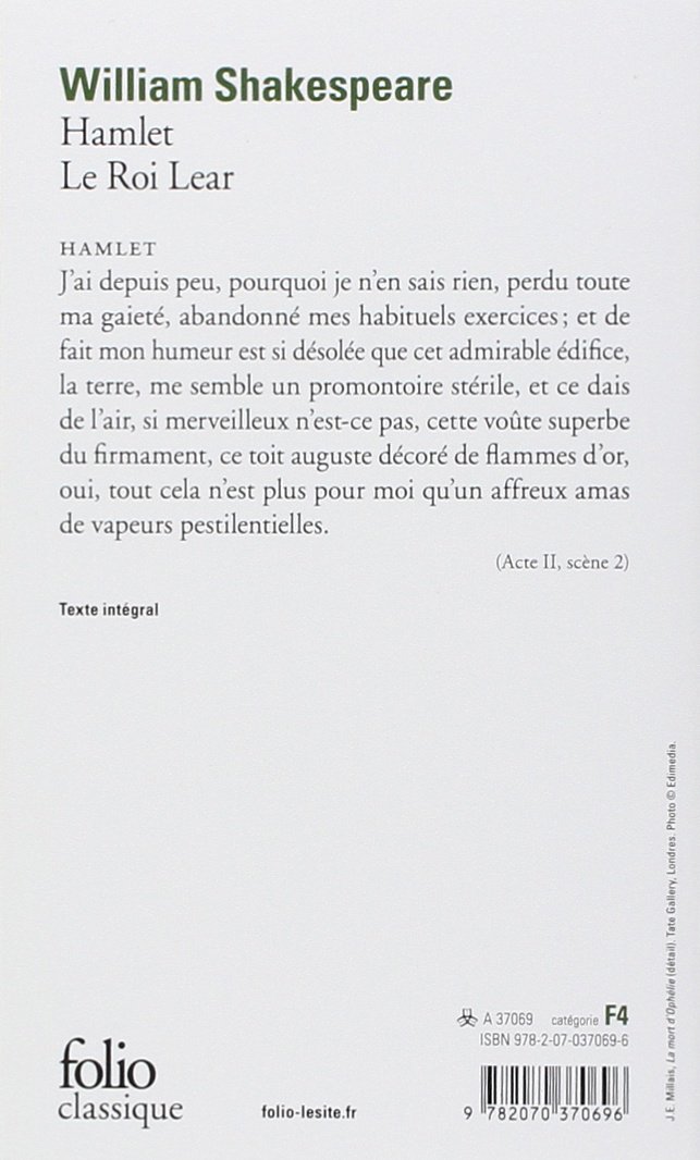 Hamlet : J'ai depuis peu, pourquoi je n'en sais rien, perdu toute ma gaieté, abandonné mes habituels exercices ; et de fait mon humeur est si désolée que cet admirable édifice, la terre, me semble un promontoire stérile, et ce dais de l'air, si merveilleux n'est-ce pas, cette voûte superbe du firmament, ce toit auguste décoré de flammes d'or, oui, tout cela n'est plus pour moi qu'un affreux amas de vapeurs pestilentielles. »