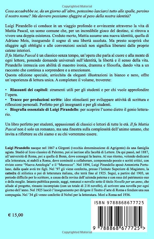 Pirandello, maestro insuperabile dell’umorismo amaro, intreccia riflessioni filosofiche, ironia tagliente e situazioni paradossali in un romanzo che continua a parlare ai lettori di ogni generazione. Il fu Mattia Pascal non è solo la storia di un uomo in fuga dal proprio passato, ma una profonda riflessione sulla complessità dell’animo umano, sull’importanza delle convenzioni sociali e sulla fragilità della nostra identità. Questa edizione arricchita si distingue per la sua attenzione ai dettagli e per i contenuti esclusivi che accompagnano il testo: Illustrazioni in bianco e nero: eleganti e suggestive, una per ogni capitolo, per immergere il lettore nelle atmosfere del romanzo. Riassunti dei capitoli: utilissimi per gli studenti e non solo, rendono più agevole l’approfondimento dell’opera. Tracce per produzioni scritte: idee stimolanti per riflettere e sviluppare attività di scrittura (consigliato per gli insegnanti) e per elaborati personali; perfette per studenti di scuole superiori e universitari. Biografia schematizzata dell’autore: per scoprire la vita e il contesto culturale che hanno plasmato Luigi Pirandello. Un volume pensato non solo per chi vuole riscoprire un classico, ma anche per chi lo affronta per la prima volta. Questa versione non è solo un omaggio al genio di Pirandello, ma una guida completa e affascinante per comprendere il suo messaggio senza tempo. Se ami i grandi temi dell’identità, della libertà e della ricerca di sé, se sei uno studente che vuole esplorare i classici in modo nuovo, o un lettore appassionato in cerca di un’esperienza unica, questa versione de Il fu Mattia Pascal è quella che fa per te. Non lasciarti sfuggire l’opportunità di vivere uno dei capolavori della letteratura italiana come mai prima d’ora. Ordina subito questa edizione speciale e immergiti in un viaggio straordinario nella mente e nel cuore di uno dei più grandi scrittori del Novecento!