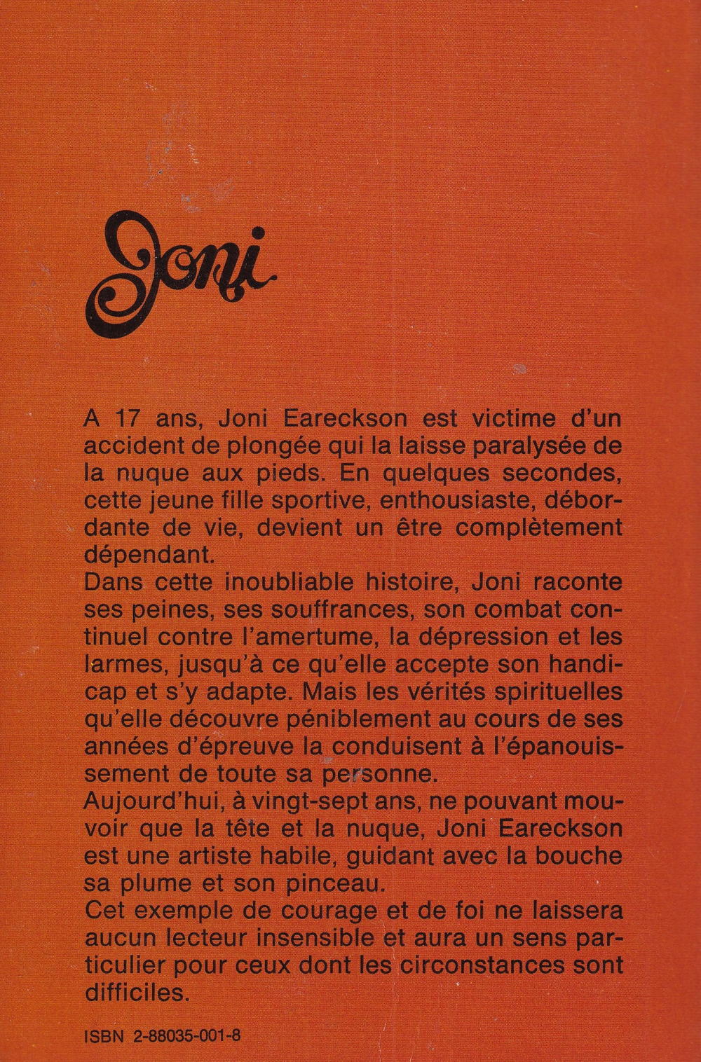 A 17 ans, Joni Eareckson est victime d'un accident de plongée qui la laisse paralysée de la nuque aux pieds. En quelques secondes, cette jeune fille sportive, enthousiaste, débordante de vie, devient un être complètement dépendant. Dans cette inoubliable histoire, Joni raconte ses peines, ses souffrances, son combat continuel contre l'amertume, la dépression et les larmes, jusqu'à ce qu'elle accepte son handicap et s'y adapte. Mais les vérités spirituelles qu'elle découvre péniblement au cours de ses années d'épreuve la conduisent à l'épanouissement de toute sa personne. Aujourd'hui, à vingt-sept ans, ne pouvant mouvoir que la tête et la nuque, Joni Eareckson est une artiste habile, guidant avec la bouche sa plume et son pinceau. Cet exemple de courage et de foi ne laissera aucun lecteur insensible et aura un sens particulier pour ceux dont les circonstances sont difficiles.