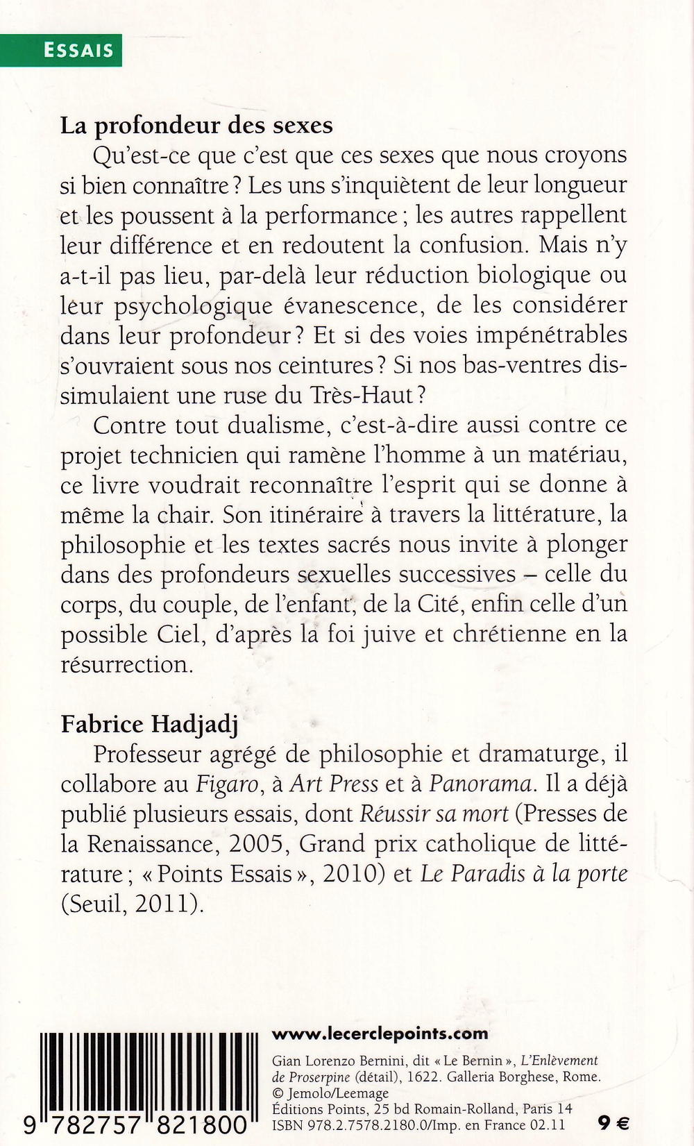 Contre tout dualisme, c'est-à-dire aussi contre ce projet technicien qui ramène l'homme à un matériau, ce livre voudrait reconnaître l'esprit qui se donne à même la chair. Son itinéraire à travers la littérature, la philosophie et les textes sacrés nous invite à plonger dans des profondeurs sexuelles successives - celle du corps, du couple, de l'enfant, de la Cité, enfin celle d'un possible Ciel, d'après la foi juive et chrétienne en la résurrection.