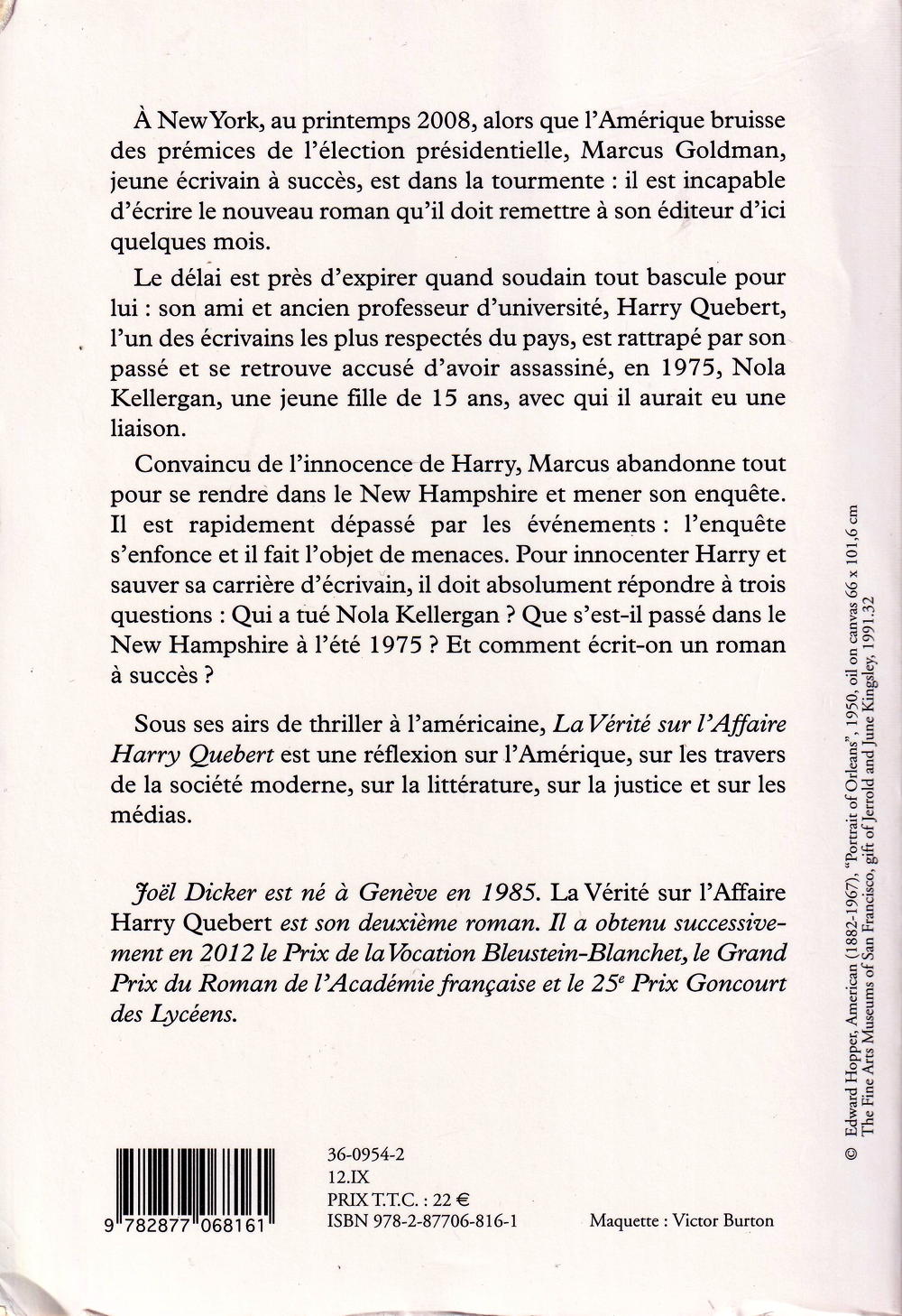 À New York, au printemps 2008, alors que l’Amérique bruisse des prémices de l’élection présidentielle, Marcus Goldman, jeune écrivain à succès, est dans...› Lire la suite la tourmente : il est incapable d’écrire le nouveau roman qu’il doit remettre à son éditeur d’ici quelques mois. Le délai est près d’expirer quand soudain tout bascule pour lui : son ami et ancien professeur d’université, Harry Quebert, l’un des écrivains les plus respectés du pays, est rattrapé par son passé et se retrouve accusé d’avoir assassiné, en 1975, Nola Kellergan, une jeune fille de 15 ans, avec qui il aurait eu une liaison.