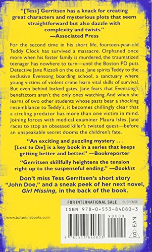 For the second time in his short life, fourteen-year-old Teddy Clock has survived a massacre. Orphaned once more when his foster family is murdered, the traumatized teenager has nowhere to turn—until the Boston PD puts Detective Jane Rizzoli on the case. Jane spirits Teddy to the exclusive Evensong boarding school, a sanctuary where young victims of violent crime learn vital skills of survival. But even behind locked gates, Jane fears that Evensong’s benefactors aren’t the only ones watching. And when she learns of two other students whose pasts bear a shocking resemblance to Teddy’s, it becomes chillingly clear that a circling predator has more than one victim in mind. Joining forces with medical examiner Maura Isles, Jane races to stop an obsessed killer’s twisted quest—before an unspeakable secret dooms the children’s fate.