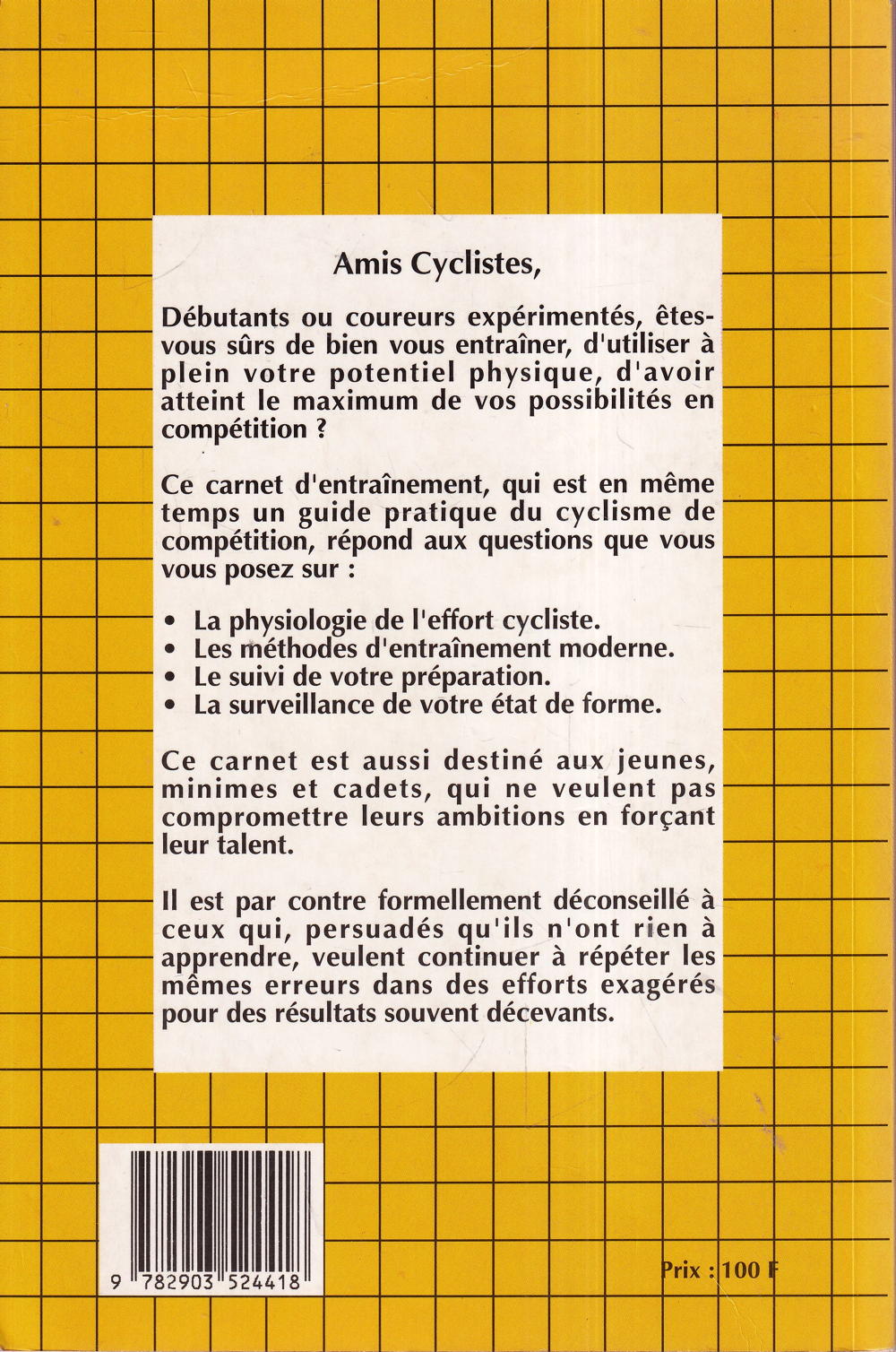 Résumé du Livre: Débutants ou coureurs expérimentés, êtes-vous sûrs de bien vous entraîner, d’utiliser à plein votre potentiel physique, d’avoir atteint le maximum de vos possibilités en compétition ? Ce carnet d’entrainement, qui est en même temps un guide pratique du cyclisme de compétition, répond aux questions que vous vous posez sur: - La physiologie de l’effort cycliste - Les méthodes de votre préparation - La surveillance de votre état de forme. Ce carnet est aussi destiné aux jeunes, minimes et cadets, qui ne veulent pas compromettre leurs ambitions en forçant leur talent. Il est par contre formellement déconseillé à ceux qui, persuadés qu’ils n’ont rien à apprendre, veulent continuer à répéter les mêmes erreurs dans des efforts exagérés pour des résultats souvent décevants. (Résumé ajouté par hotel-du-livre).