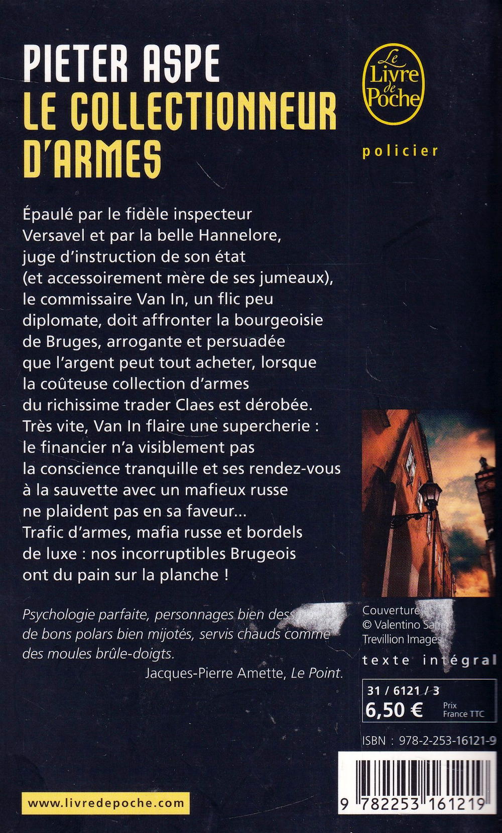 Épaulé par le fidèle inspecteur Versavel et par la belle Hannelore, juge d'instruction de son état (et accessoirement mère de ses jumeaux), le commissaire Van In, un flic peu catholique et peu diplomate, va devoir affronter la bourgeoisie de Bruges, arrogante et persuadée que l’argent peut tout acheter, lorsque la coûteuse collection d'armes du richissime trader Claes est dérobée. Très vite, Van In flaire une supercherie: le financier n'a visiblement pas la conscience tranquille et ses rendez-vous à la sauvette avec un mafieux russe ne plaident pas en sa faveur...Trafic d'armes, mafia russe et bordels de luxe: nos incorruptibles Brugeois ont du pain sur la planche !