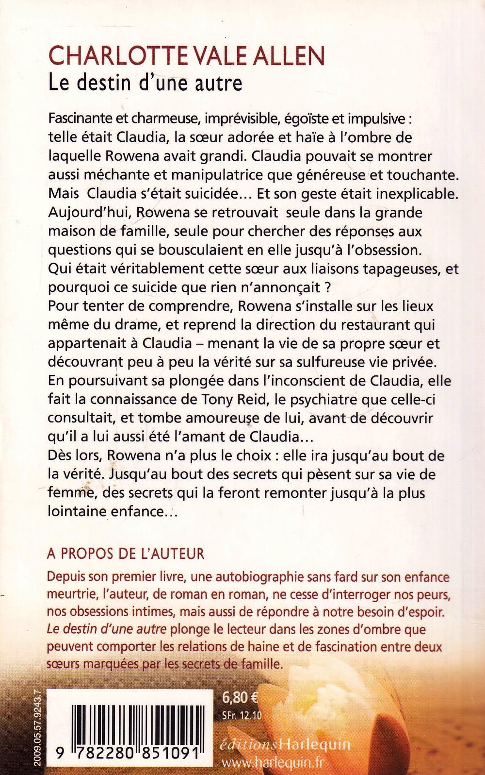 Fascinante et charmeuse, imprévisible, égoïste et impulsive : telle était Claudia, la soeur adorée et haïe à l'ombre de laquelle Rowena avait grandi. Claudia pouvait se montrer aussi méchante et manipulatrice que généreuse et touchante. Mais Claudia s'était suicidée... Et son geste était inexplicable. Aujourd'hui, Rowena se retrouvait seule dans la grande maison de famille, seule pour chercher des réponses aux questions qui se bousculaient en elle jusqu'à l'obsession. Qui était véritablement cette sur aux liaisons tapageuses, et pourquoi ce suicide que rien n'annonçait ? Pour tenter de comprendre, Rowena s'installe sur les lieux même du drame, et reprend la direction du restaurant qui appartenait à Claudia menant la vie de sa propre sur et découvrant peu à peu la vérité sur sa sulfureuse vie privée. En poursuivant sa plongée dans l'inconscient de Claudia, elle fait la connaissance de Tony Reid, le psychiatre que celle-ci consultait, et tombe amoureuse de lui, avant de découvrir qu'il a lui aussi été l'amant de Claudia... Dès lors, Rowena n'a plus le choix : elle ira jusqu'au bout de la vérité. Jusqu'au bout des secrets qui pèsent sur sa vie de femme, des secrets qui la feront remonter jusqu'à la plus lointaine enfance...