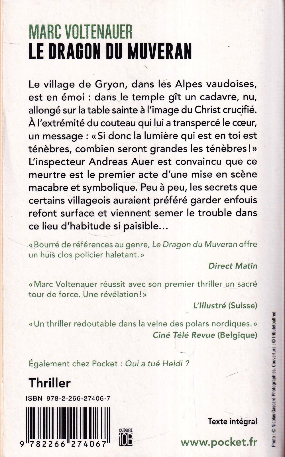 Né en 1973 à Genève, Marc Voltenauer se destinait à être pasteur. Après des études de théologie protestante, il s'engage comme secrétaire général d'une association chrétienne, puis opte pour les ressources humaines au sein d'une banque. Membre de la direction d'une société pharmaceutique, il écrit son premier roman, Le Dragon du Muveran, à l'issue d'une année sabbatique. Ce polar nordique au coeur des Alpes vaudoises est publié aux Éditions Plaisir de Lire en 2015, puis chez Slatkine & Cie en 2016. Best-seller en Suisse, Le Dragon a obtenu le Prix SPG au Salon du livre de Genève. La suite des aventures d'Andreas Auer, Qui a tué Heidi ?, a paru en 2017 chez le même éditeur. Retrouvez toute l'actualité de l'auteur sur: www. marcvoltenauer. com