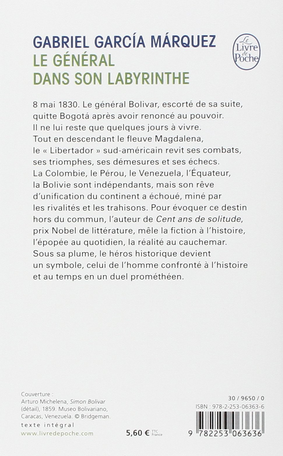 8 mai 1830. Le général Bolivar, escorté de sa suite, quitte Bogota après avoir renoncé au pouvoir. Il ne lui reste que quelques jours à vivre. Tout en descendant le fleuve Magdalena, le « Libertador » sud-américain revit ses combats, ses triomphes, ses démesures et ses échecs. La Colombie, le Pérou, le Venezuela, l’Equateur, la Bolivie sont indépendants, mais son rêve d’unification du continent a échoué, miné par les rivalités et les trahisons. Pour évoquer ce destin hors du commun, l’auteur de Cent Ans de solitude, prix Nobel de littérature 1982, mêle la fiction à l’histoire, l’épopée au quotidien, la réalité au cauchemar. Sous sa plume, le héros historique devient un symbole, celui de l’homme confronté à l’histoire et au temps en un duel prométhéen.