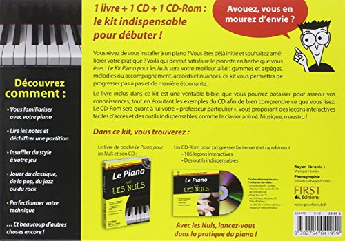 Pratique et malin, ce kit comprendra: le livre poche du Piano pour les Nuls (distribué exclusivement dans ce coffret); le CD audio du livre; et une super méthode d'apprentissage interactive complémentaire, sur CD-rom ! Avec ce CD-rom exceptionnel, vous aurez entre les mains: - 40 leçons progressives, pour avancer pas à pas; - un produit de haute qualité: chansons et exercices accompagnés par des vidéos full-motion, des enregistrements audio en direct - une interface interactive et pratique: les notes et les accords se colorent progressivement sur la partition, et les positions qui apparaissent simultanément sur le clavier. - la possibilité d'apprendre les grands tubes du piano - Inclus: un métronome digital, un enregistreur digital.