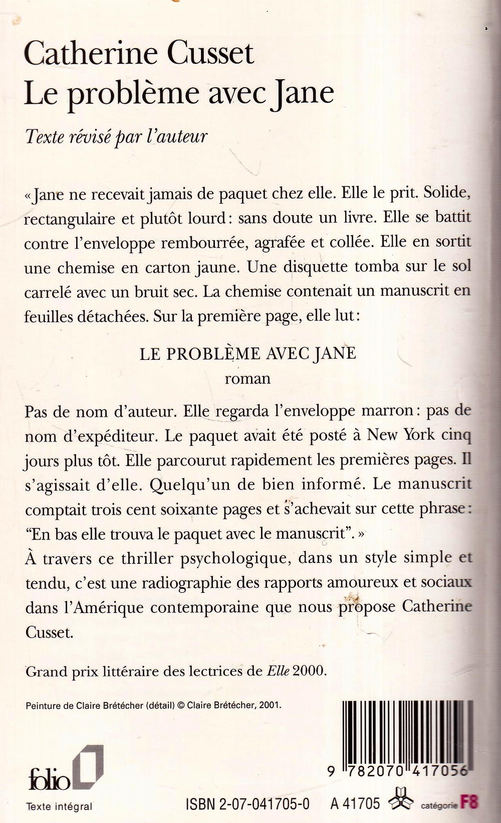 Jane ne recevait jamais de paquet chez elle. Elle le prit. Solide, rectangulaire et plutôt lourd: sans doute un livre. Elle se battit contre l'enveloppe rembourrée, agrafée et collée. Elle en sortit une chemise en carton jaune. Une disquette tomba sur le sol carrelé avec un bruit sec. La chemise contenait un manuscrit en feuilles détachées. Sur la première page, elle lut: LE PROBLEME AVEC JANE roman. Pas de nom d'auteur. Elle regarda l'enveloppe marron: pas de nom d'expéditeur. Le paquet avait été posté à New York cinq jours plus tôt. Elle parcourut rapidement les premières pages. Il s'agissait d'elle. Quelqu'un de bien informé. Le manuscrit comptait trois cent soixante pages et s'achevait sur cette phrase: En bas elle trouva le paquet avec le manuscrit . A travers ce thriller psychologique, dans un style simple et tendu, c'est une radiographie des rapports amoureux et sociaux dans l'Amérique contemporaine que nous propose Catherine Cusset.