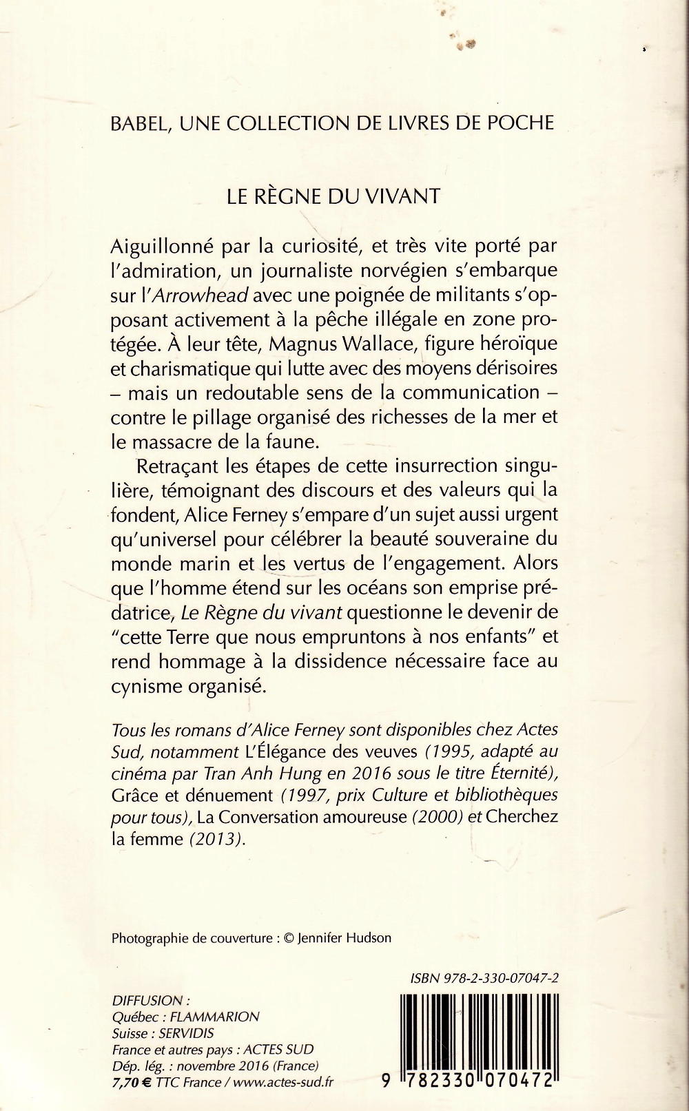 Aiguillonné par la curiosité, et très vite porté par l'admiration, un journaliste norvégien s'embarque sur l'Arrowhead avec une poignée de militants s'opposant activement à la pêche illégale en zone protégée. A leur tête, Magnus Wallace, figure héroïque et charismatique qui lutte avec des moyens dérisoires - mais un redoutable sens de la communication - contre le pillage organisé des richesses de la mer et le massacre de la faune. Retraçant les étapes de cette insurrection singulière, témoignant des discours et des valeurs qui la fondent, Alice Ferney s'empare d'un sujet aussi urgent qu'universel pour célébrer la beauté souveraine du monde marin et les vertus de l'engagement. Alors que l'homme étend sur les océans son emprise prédatrice, Le Règne du vivant questionne le devenir de cette Terre que nous empruntons à nos enfants et rend hommage à la dissidence nécessaire face au cynisme organisé.
