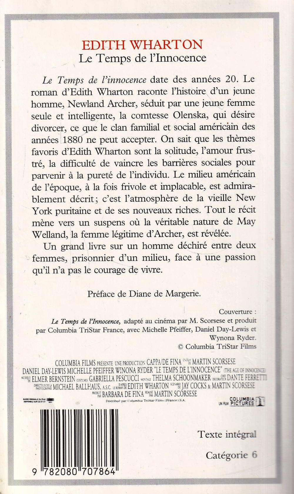 Le Temps de l'innocence date des années 20. L e roman d'Edith Wharton raconte l'histoire d'un jeune homme, Newland Archer, séduit par une jeune femme seule et intelligente, la comtesse Olenska, qui désire divorcer, ce que le clan familial et social américain des années 1880 ne peut accepter. On sait que les thèmes favoris d'Edith Wharton sont la solitude, l'amour frustré, la difficulté de vaincre les barrières sociales pour parvenir à la pureté de l'individu. Le milieu américain de l'époque à la fois frivole et implacable, est admirablement décrit; c'est l'atmosphère de la vieille New York puritaine et de ses nouveaux riches. Tout le récit mène vers un suspens où la véritable nature de May Welland, la femme légitime d'Archer, est révélée. Un grand livre sur un homme déchiré entre deux femmes, prisonnier d'un milieu, face à une passion qu'il n'a pas le courage de vivre. Quatrième de couverture Le Temps de l'innocence date des années 20. L e roman d'Edith Wharton raconte l'histoire d'un jeune homme, Newland Archer, séduit par une jeune femme seule et intelligente, la comtesse Olenska, qui désire divorcer, ce que le clan familial et social américain des années 1880 ne peut accepter. On sait que les thèmes favoris d'Edith Wharton sont la solitude, l'amour frustré, la difficulté de vaincre les barrières sociales pour parvenir à la pureté de l'individu. Le milieu américain de l'époque à la fois frivole et implacable, est admirablement décrit ; c'est l'atmosphère de la vieille New York puritaine et de ses nouveaux riches. Tout le récit mène vers un suspens où la véritable nature de May Welland, la femme légitime d'Archer, est révélée. Un grand livre sur un homme déchiré entre deux femmes, prisonnier d'un milieu, face à une passion qu'il n'a pas le courage de vivre.