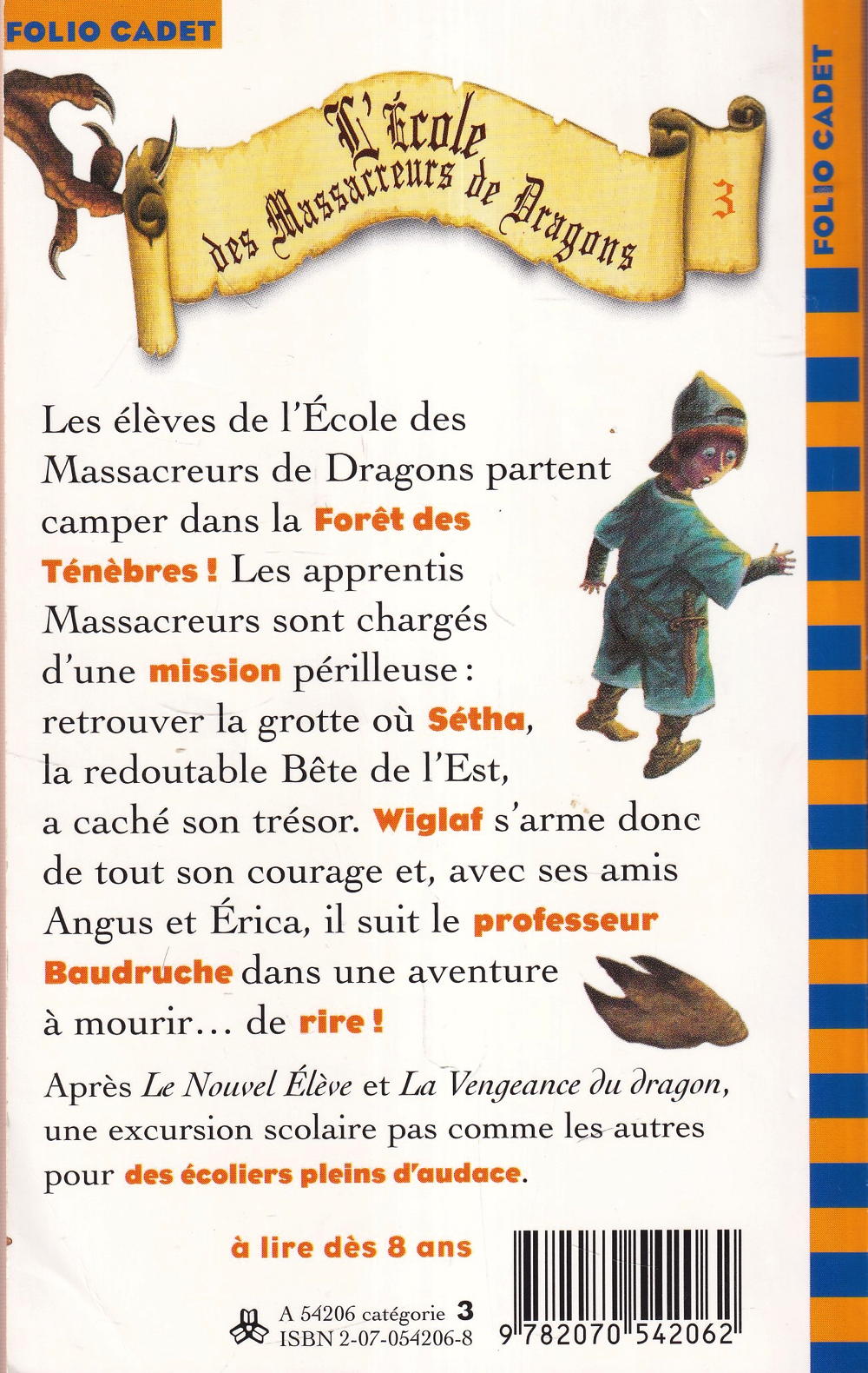 Les élèves de l'École des Massacreurs de Dragons partent camper dans la Forêt des Ténèbres ! Les apprentis Massacreurs sont chargés d'une mission périlleuse : retrouver la grotte où Sétha, la redoutable Bête de l'Est, a caché son trésor. Wiglaf s'arme donc de tout son courage et, avec ses amis Angus et Érica, il suit le professeur Baudruche dans une aventure à mourir... de rire ! Après Le Nouvel Élève et La Vengeance du dragon, une excursion scolaire pas comme les autres pour des écoliers pleins d'audace.