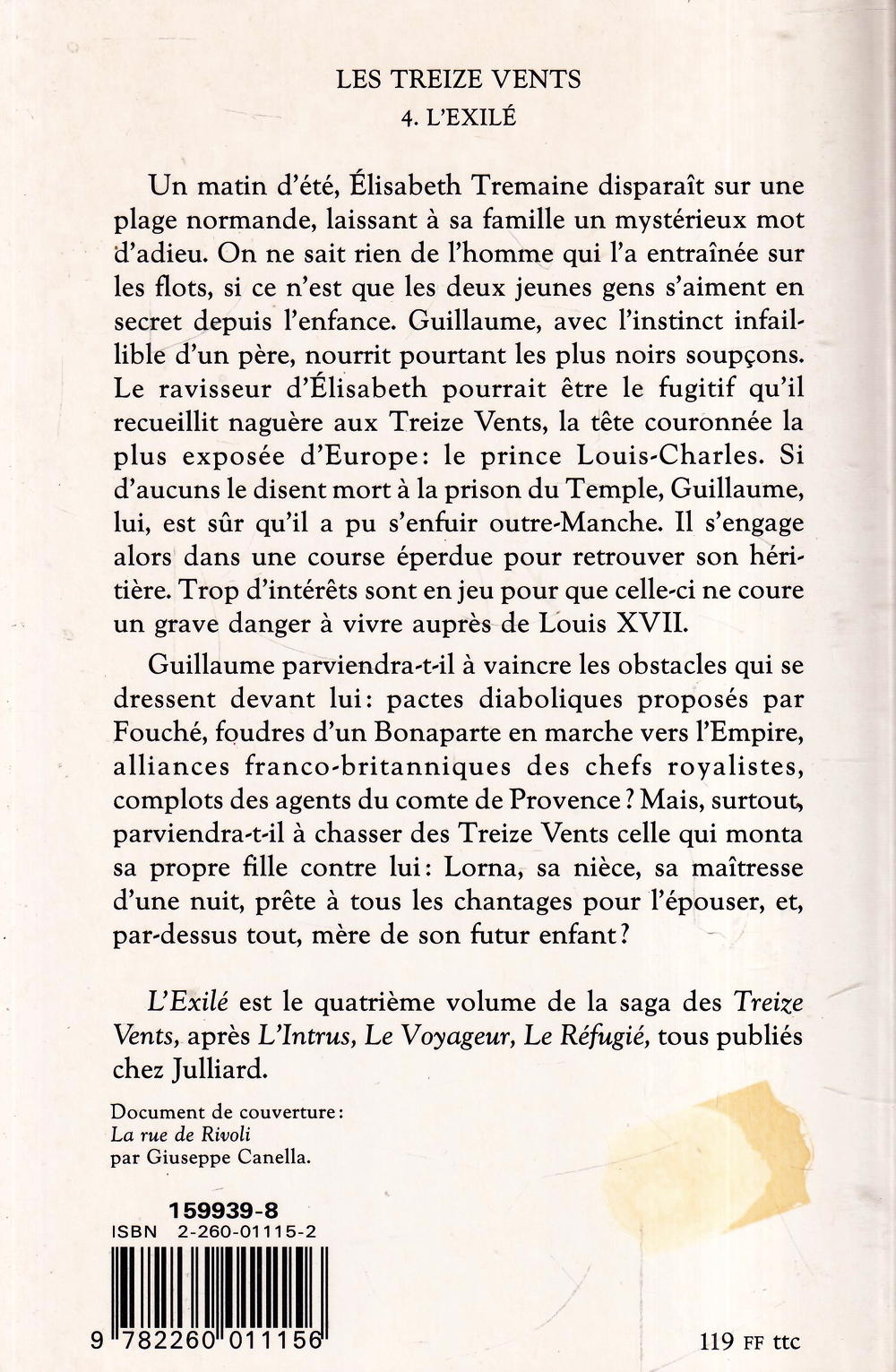 Un matin d'été, Elisabeth Tremaine disparaît sur une plage normande, laissant à sa famille un mystérieux mot d'adieu. On ne sait rien de l'homme qui l'a entraînée sur les flots, si ce n'est que les deux jeunes gens s'aiment en secret depuis m'enfance. Guillaume, avec l'instinct infaillible d'un père, nourrit pourtant les plus noirs soupçons. Le ravisseur d'Elisabeth pourrait être le fugitif qu'il recueillit naguère aux treize Vents, la tête couronnée la plus exposée d'Europe: le prince Louis-Charles. Si d'aucunsle disent mort à la prison du Temple, Guillaume, lui, est sûr qu'il a pu s'enfuir outre-manche. Il s'engage alors dansune course éperdue pour retrouver son héritière. Trop d'intérêts sont en jeux pour que celle-ci ne coure un grave danger à vivre auprès de Louis XVII. Guillaume parviendra-t-il à vaincre les obstacles qui se dressent devant lui: pactes diaboliques proposés par Fouché, foudresd'un Bonaparte en marche vers l'Empire, alliances franco-britanniques des chefs royalistes, complots des agents du comte de Provence ? Mais, surtout, parviendra-t-ilà chasser des Treize Vents celle qui monta sa propre fille contre lui: Lorna, sa nièce, sa maîtresse d'une nuit, prêteà tous les chantages pour l'épouser, et, par dessus tout, mère de son futur enfant ?L'Exilé est le quatrième volume de la sage des Treize vents, après L'Intrus, Le Voyageur, Le Réfugié, tous publiés chez Julliard.