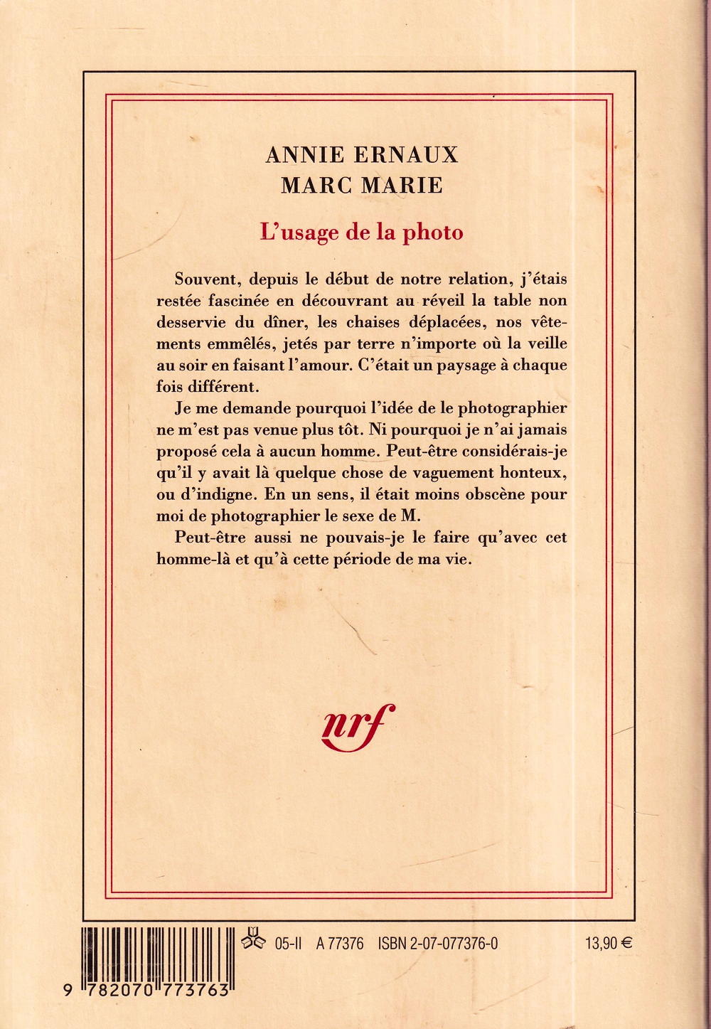 Souvent, depuis le début de notre relation, j'étais restée fascinée en découvrant au réveil la table non desservie du dîner, les chaises déplacées, nos vêtements emmêlés, jetés par terre n'importe où la veille au soir en faisant l'amour. C'était un paysage à chaque fois différent. Je me demande pourquoi l'idée de le photographier ne m'est pas venue plus tôt. Ni pourquoi je n'ai jamais proposé cela à aucun homme. Peut-être considérais-je qu'il y avait là quelque chose de vaguement honteux, ou d'indigne. En un sens, il était moins obscène pour moi de photographier le sexe de M. Peut-être aussi ne pouvais-je le faire qu'avec cet homme-là et qu'à cette période de ma vie. Quatrième de couverture
