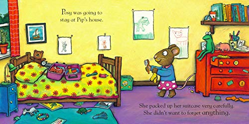 When Posy goes to stay at Pip's house they have lots of fun together before bedtime. But just as they switch out the light, disaster strikes: Posy realises that she has forgotten her favourite frog toy. Desperate to help his distraught friend, Pip offers Posy a range of different toys to substitute for her frog, including his own favourite frog money box. But none of them will do, that's the wrong frog! Posy wails. It is only when Pip gives Posy his own, very favourite, pig toy that Posy is comforted and that the friends can get a good night's sleep, at last.